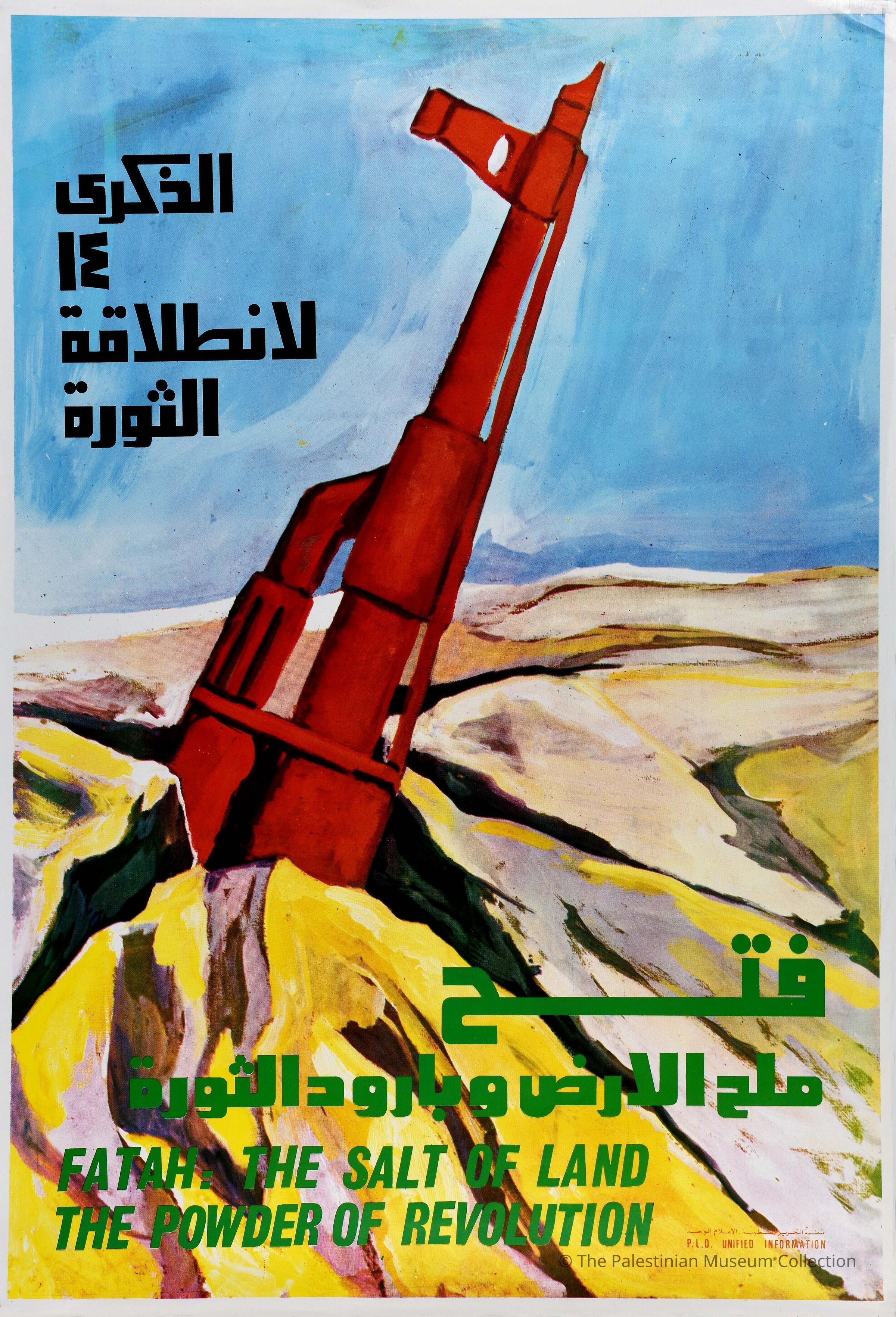 Published on the 14th anniversary of the foundation of Fateh, this colour poster shows a rifle coming out of the ground.Dimensions