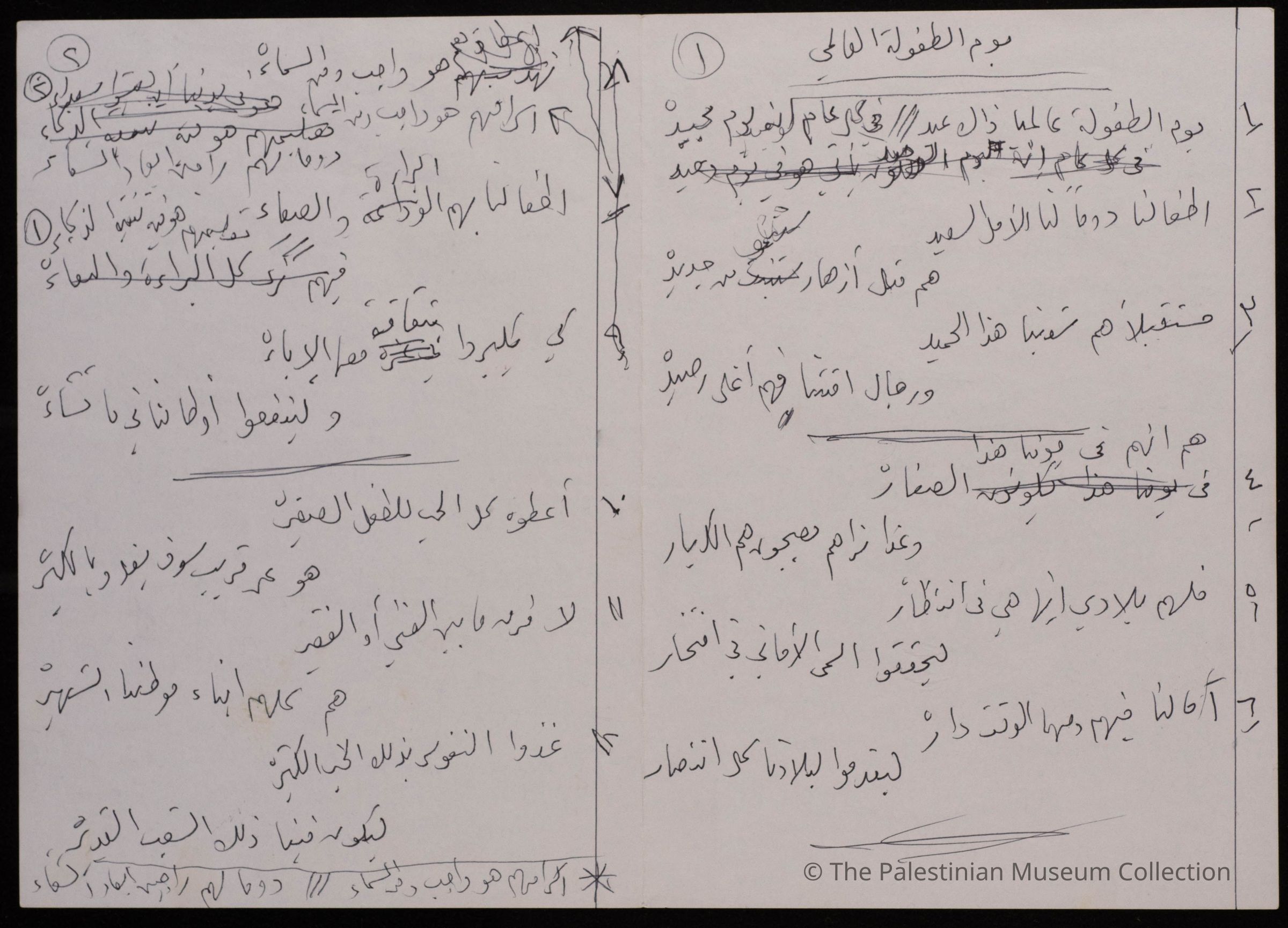 مخطوطة قصيدة باللغة العربية بعنوان" يوم الطفل العالمي" للشاعرة فاطمة المحب، ولا تحمل الوثيقة اية اشارة الى تاريخ كتابتها.