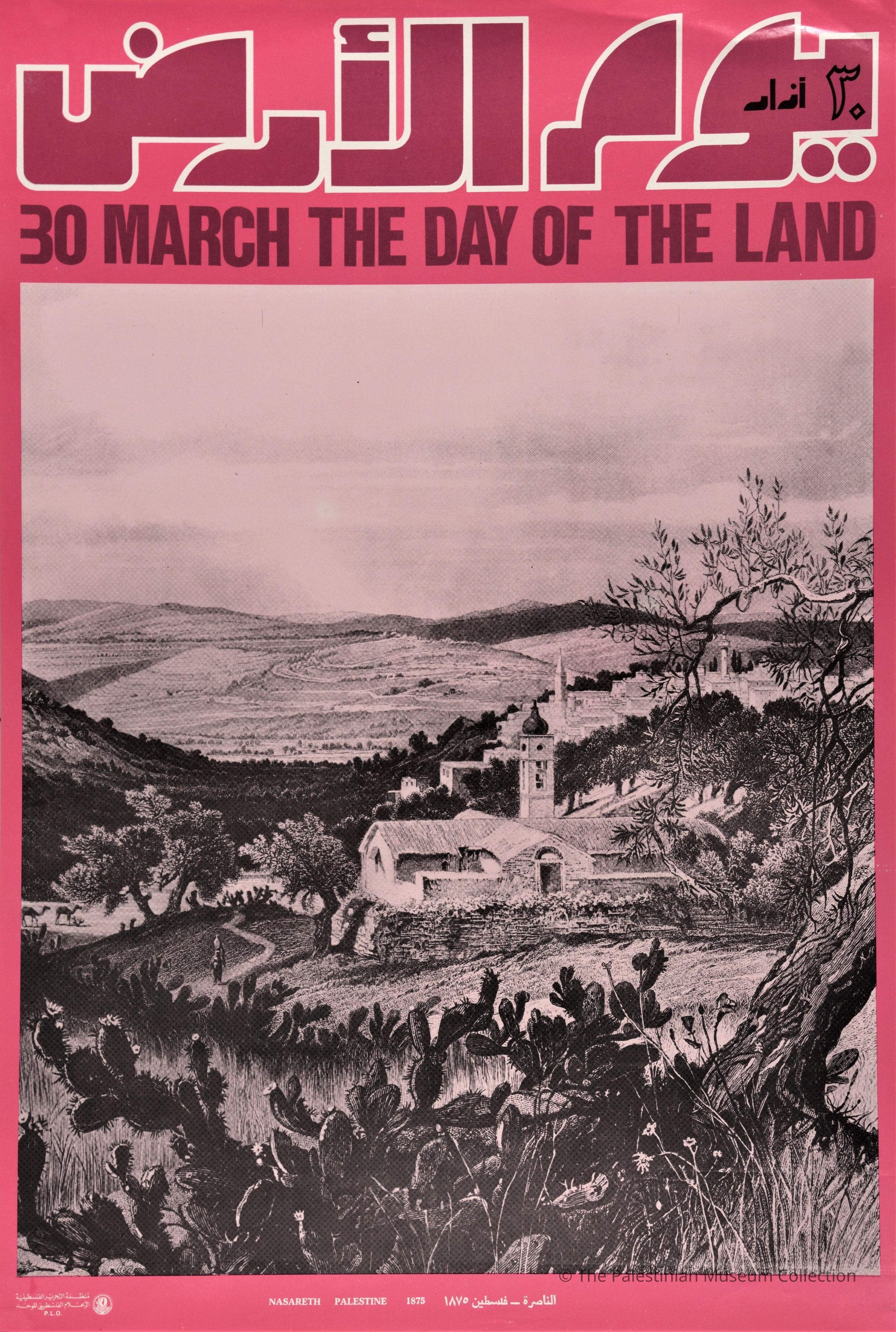 A poster entitled '30 March The Day of The Land' issued by the Unified Information Office of the Palestine Liberation Organisation (PLO) commemorating Land Day in 1983. It was designed by artist Ismail Shammout based on a lithograph by David Roberts (1875) depicting a landscape of the city of Nazareth. It is part of a series of posters made to mark this occasion. The Museum collection has one duplicate available of this poster.Dimensions