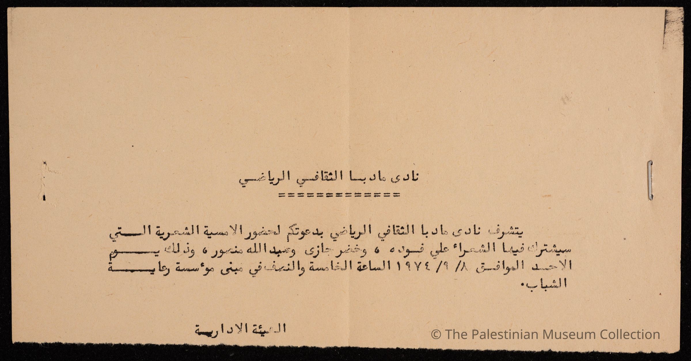 دعوة من نادي مادبا الثقافي الرياضي، تحتوي على دعوة لحضور امسية شعرية سيشارك فيها الشاعر علي فودة وخضر جازى وعبد الله منصور.