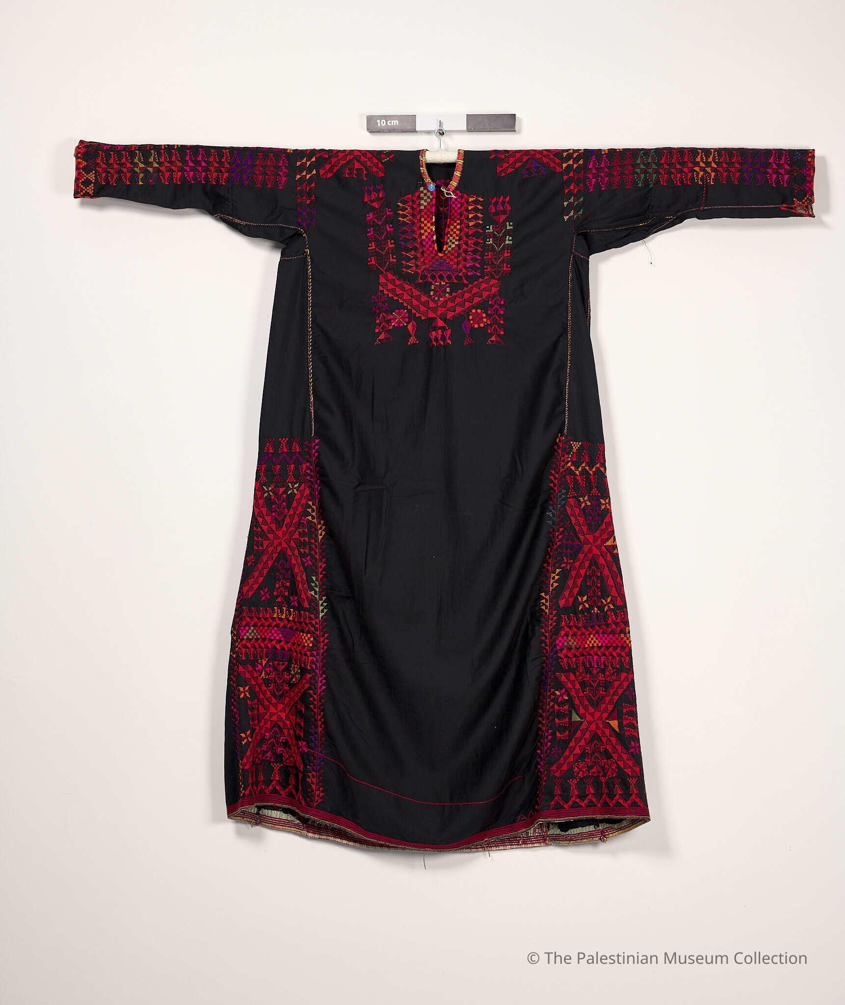 A thobe (dress) from Khan Yunis, Gaza. It is made of black cotton and embroidered with primarily red silk threads. The chest panel is heavily embroidered with cypress, fans, and feather motifs. The collar is adorned with a button and has a piece of Ottoman cloth used in making a man’s qumbaz (coat) sewn into it. As for the Nayashin (medal), they are embroidered with geometric shapes, whereas the back of the chest panel of the thobe (the upper back neckline) has a tatreez (embroidery) of feather motifs along with plant and geometric shapes. The sleeves are embroidered with fans, cypress and feather motifs, while the cuffs have a tatreez of geometric shapes and manajil (sickles) motifs. The front panel bears no tatreez, whereas the back panel is embroidered with Pasha’s tent, cypress, feather, and fans motifs. Additionally, the sides (al-Banayiq) are embroidered with cypress, feather, scissors, and the star of Bethlehem motifs along with geometric shapes.Made/Created