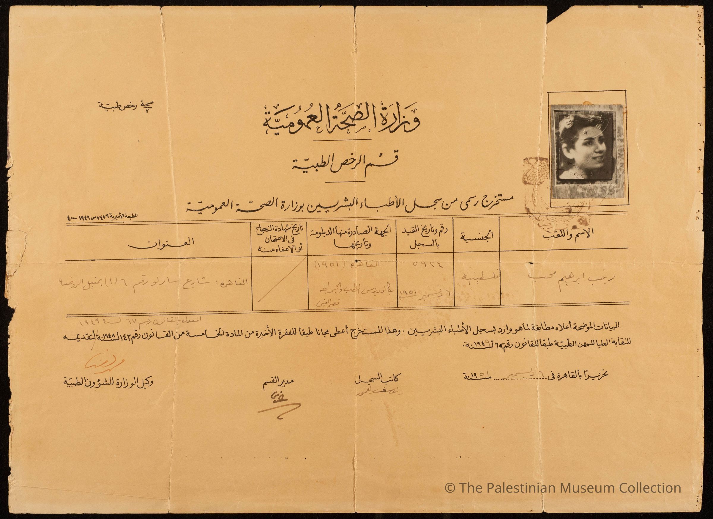 مستخرج رسمي من سجل الأطباء البشريين لزينب ابراهيم المحب، صادرة عن وزارة الصحة العمومية في القاهرة وتحتوي على بياناتها.
