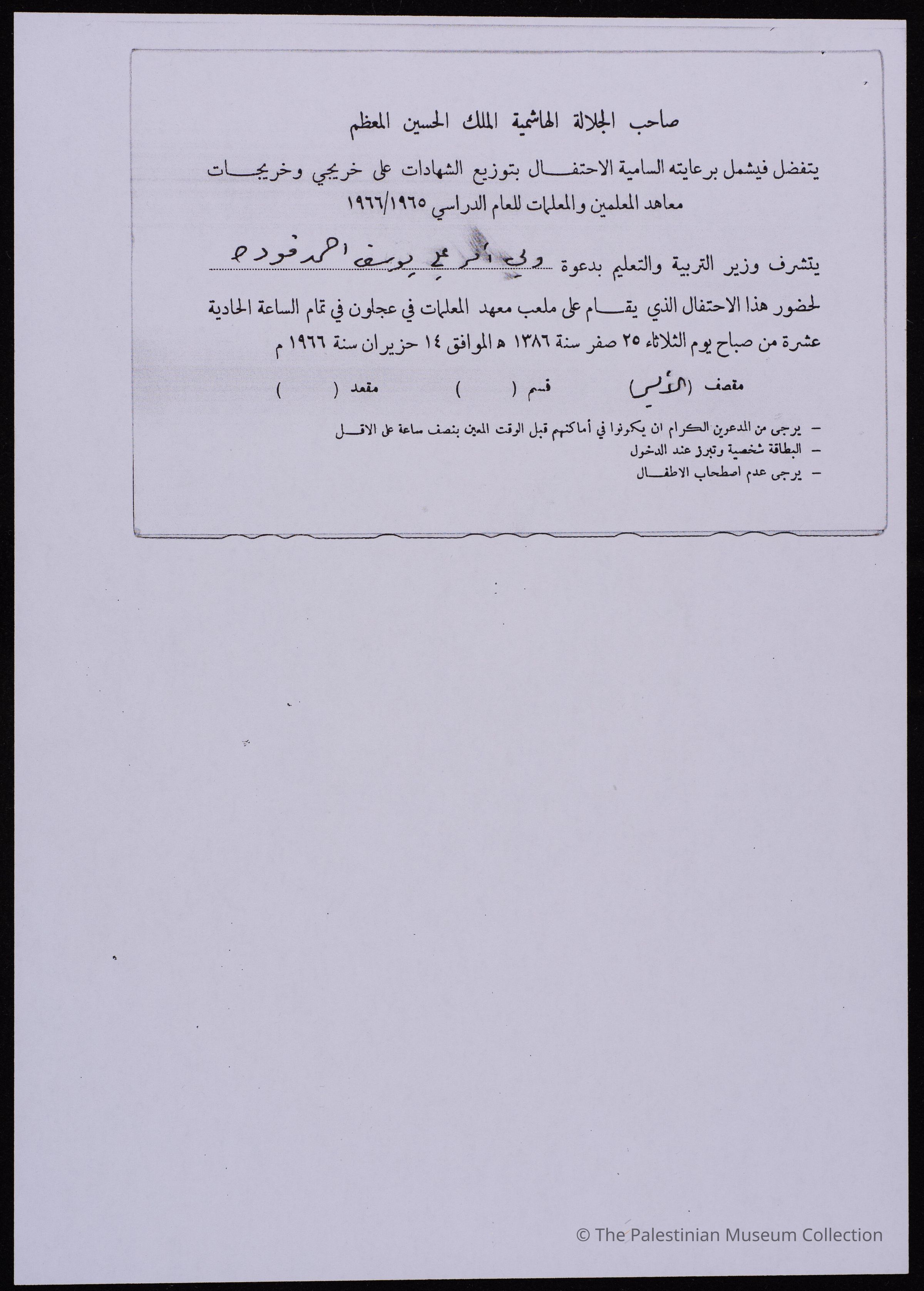 بطاقة صادرة عن معاهد المعلمين والمعلمات، وهي دعوة موجهة لولي أمر علي فودة لحضور حفل تخرجه بتاريخ 14 حزيران 1966.
