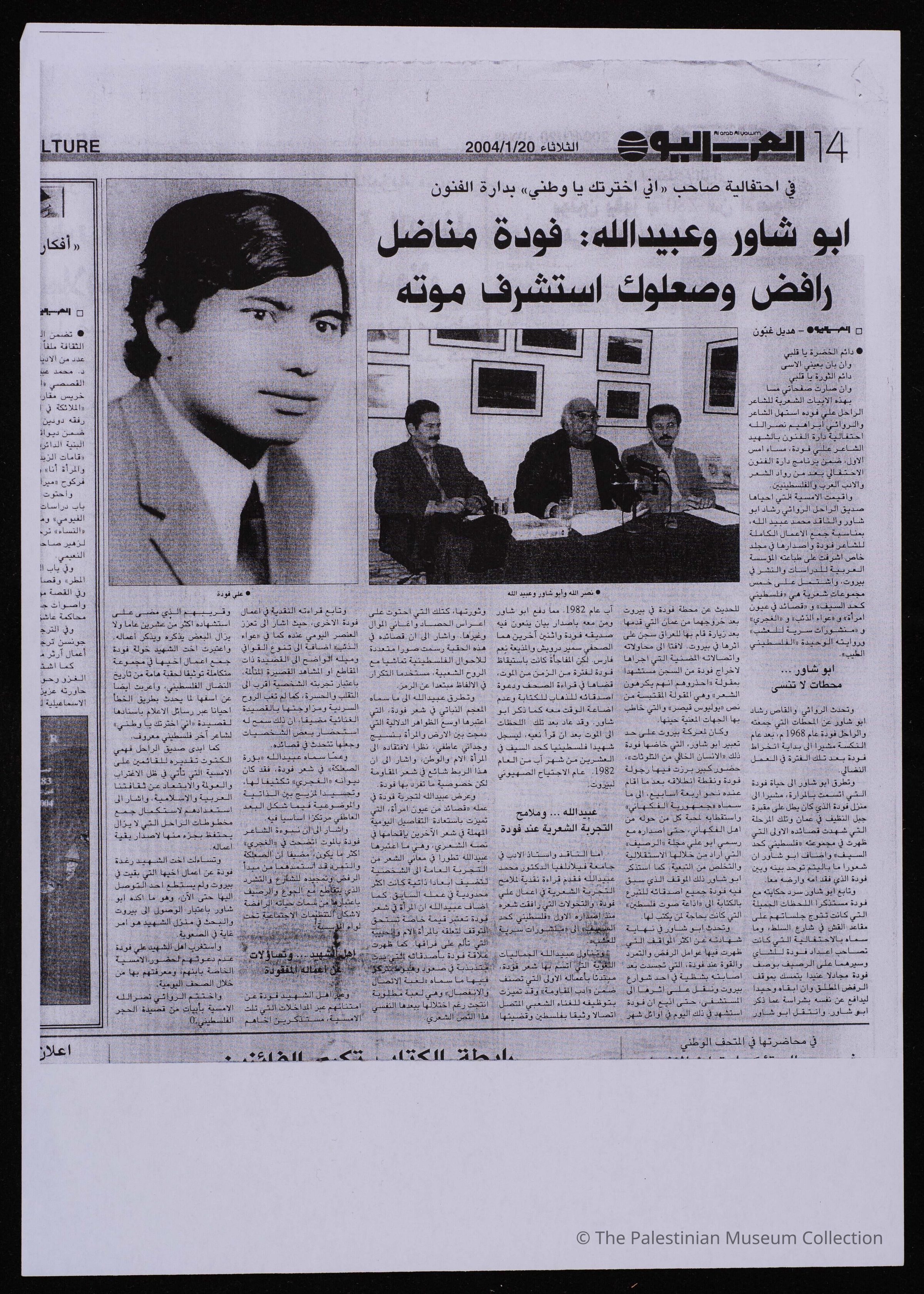 قصاصة من جريدة العرب اليوم، تحتوي على مقْالة بقلم هديل غبّون بعنوان (في احتفالية صاحب " اني اخترتك يا وطني" بدارة الفنون)، تتناول المقالة حديث أبو شاور وعبيدالله عن الشهيد الشاعر علي فودة ابو شاور وعبيدالله. مُرفق معها صورة غير ملونة للشاعر علي فودة وصورة أخرى تجمع نصرالله وأبو شاور وعبيدالله.