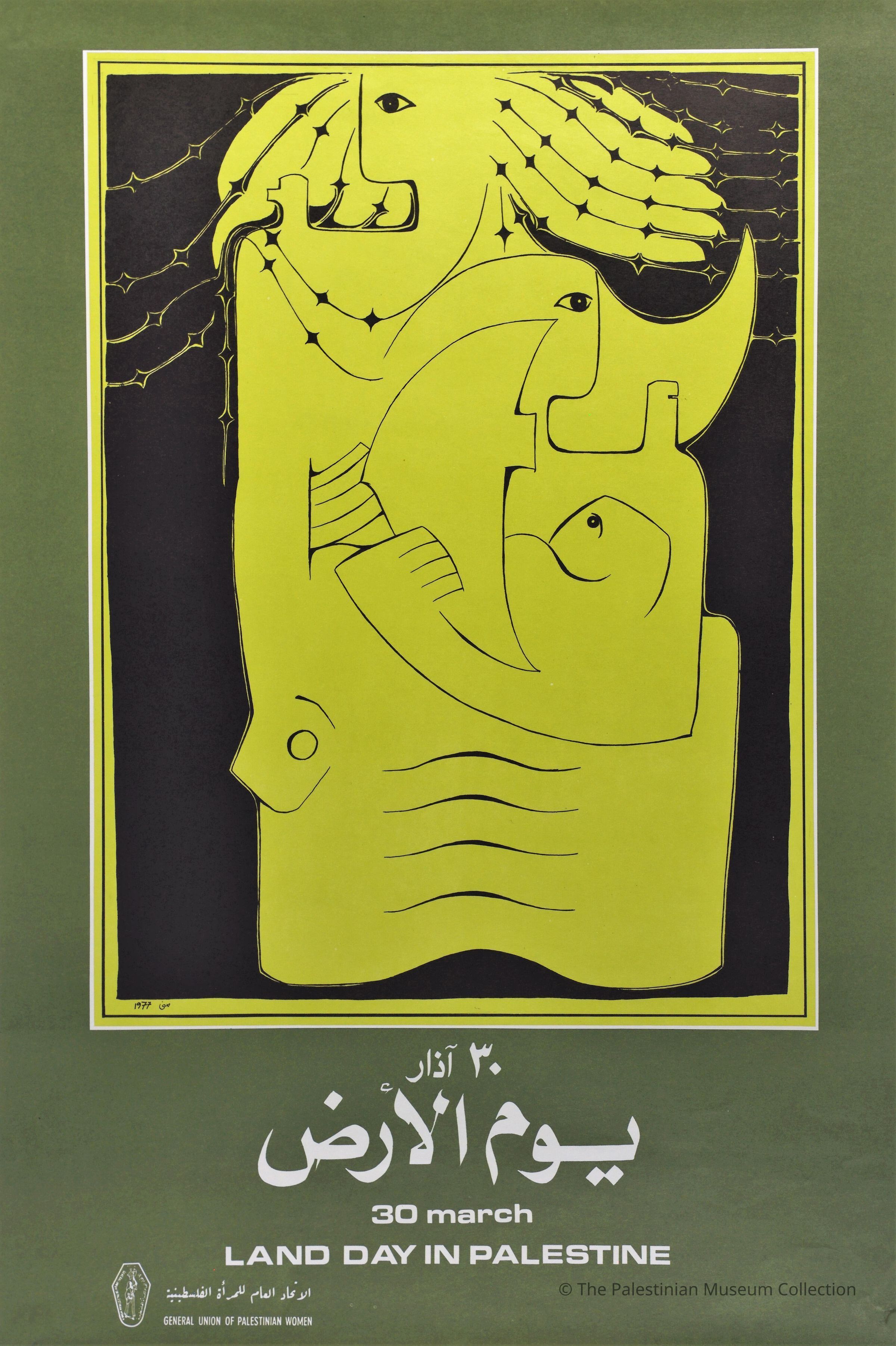 ملصق صادر عن الاتحاد العام للمرأة الفلسطينية في يوم الأرض عام 1977. تضم المطبوعة لوحة تكعيبية للفنانة التشكيلية الفلسطينية منى السعودي تصور امرأة تحمي أطفالها للعبور بلا أذى عبر أسلاكٍ شائكة.
