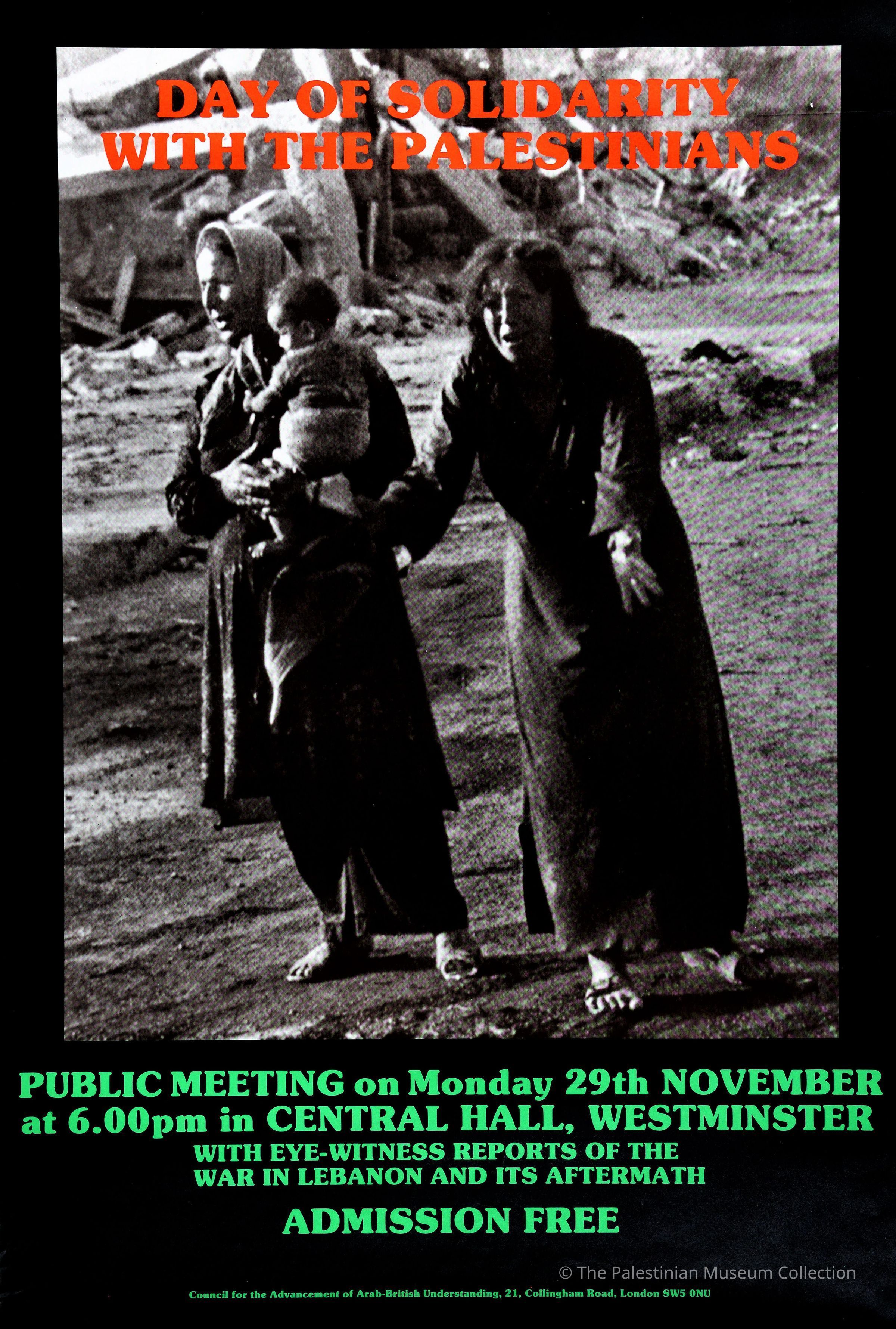 ملصق ملون، عبارة عن صورة يظهر فيها امرأة تصرح وتنتحب وامرأة ارة تحمل طفلاً وتنظر بحزن، في الخلف بعض المنازل المهدمة بشكل كلي.