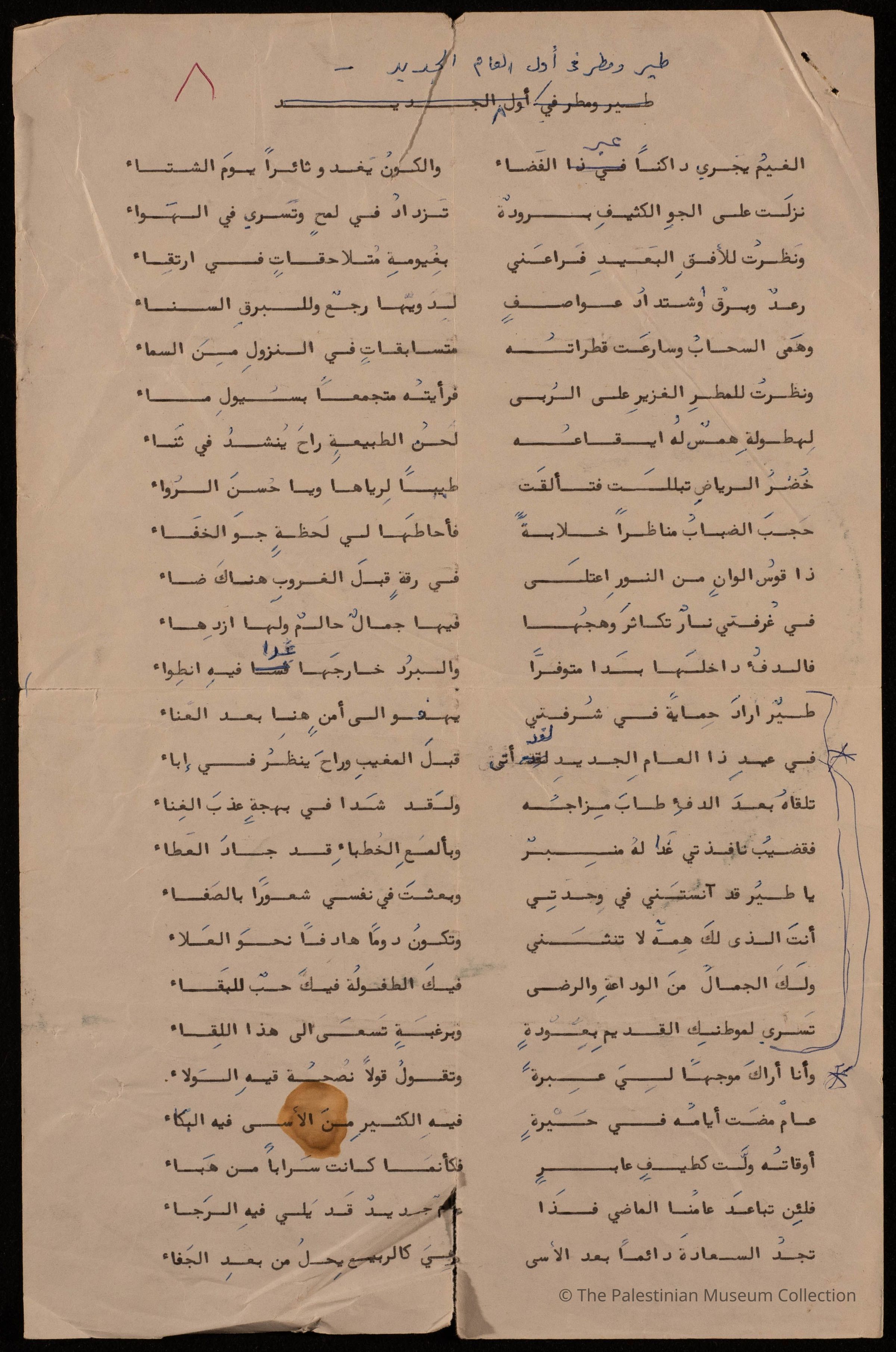 مخطوطة قصيدة بقلم فاطمة المحب بعنوان "طير ومطر في أول العام الجديد"، مكونة من صفحتين ولا تحمل أية بيانات عن تاريخ كتابتها