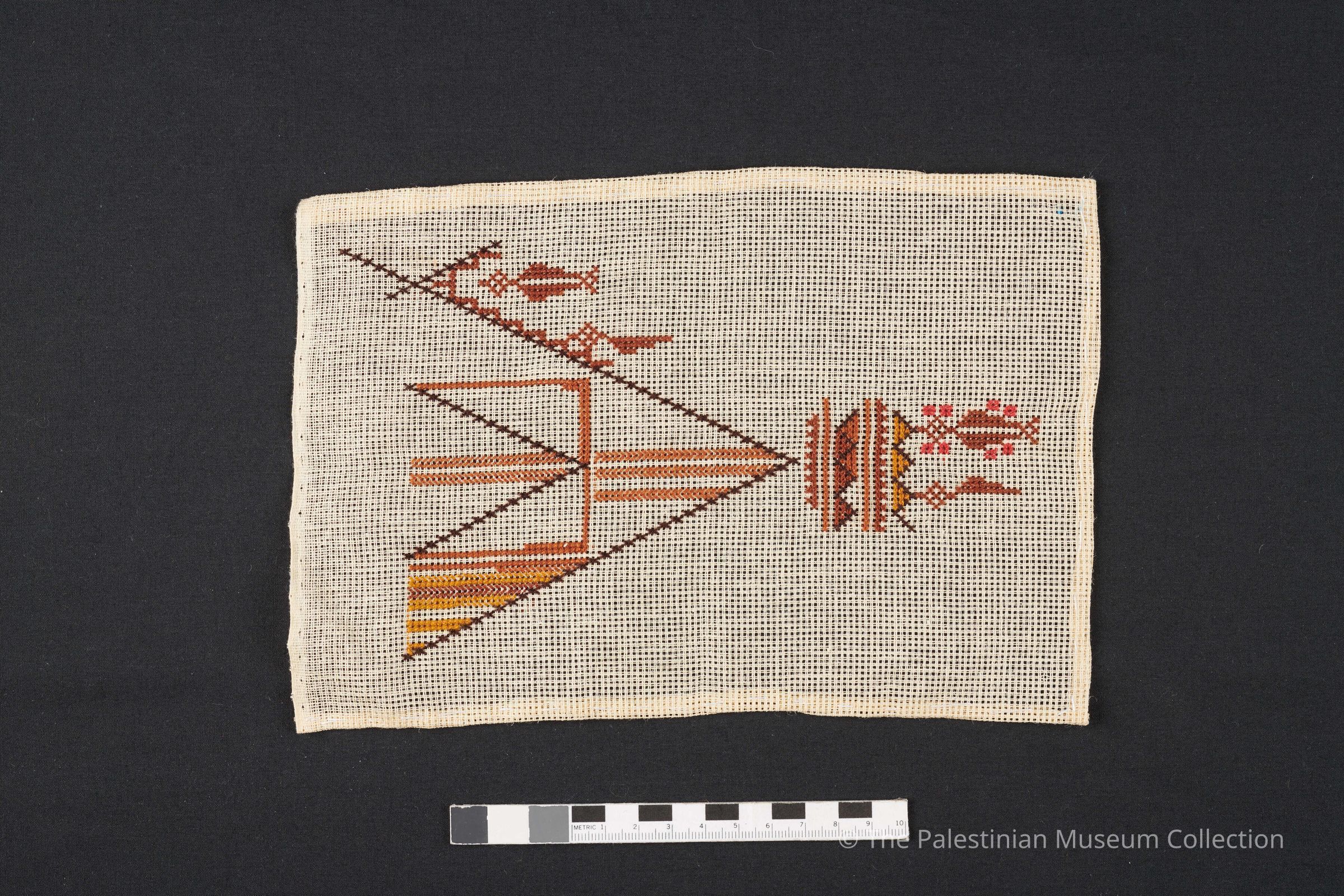 نموذج تطريز على قماش ايتامين بحرير لون بني درجتين واصفر واحمر برسومات متعددة منها السرو