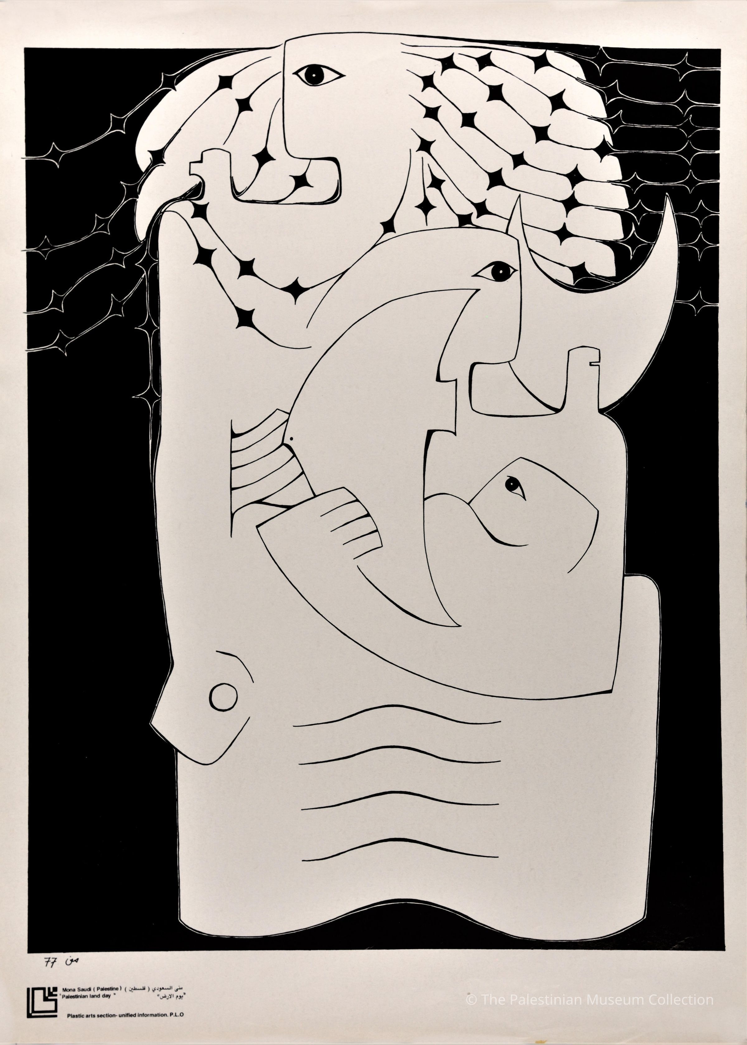 This poster entitled 'Palestinian land day' features 1977 artwork by the artist Mona Saudi. It was issued by the General Union of Palestinian Women (GUPW) in commemoration of Land Day, marked on March 30th.Dimensions