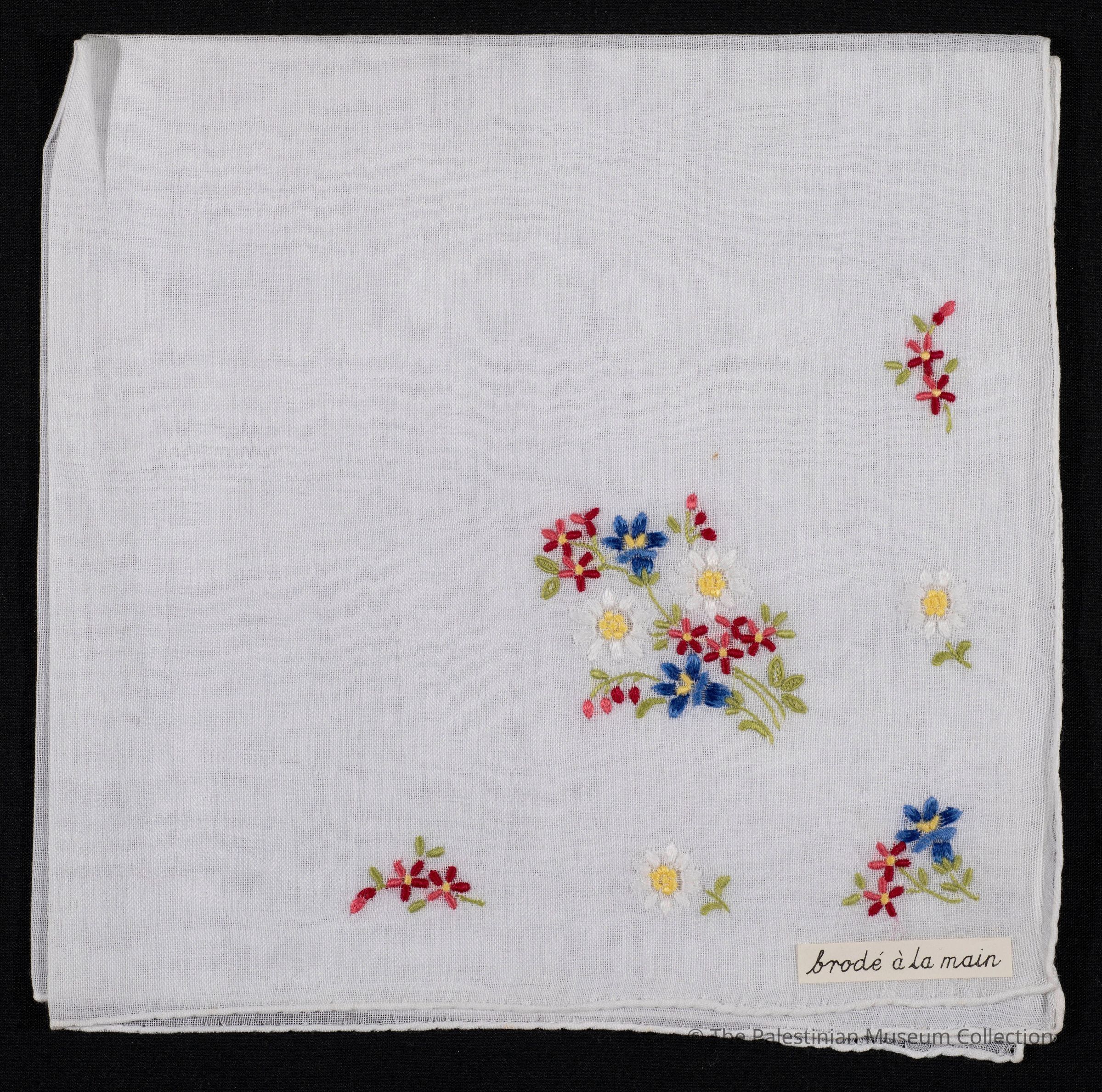 منديل سفرة، من قماش القطن باللون الأبيض، مُطرّز بخيوط حرير باللون الفوشي والأزرق والأصفر على شكل زهور.
