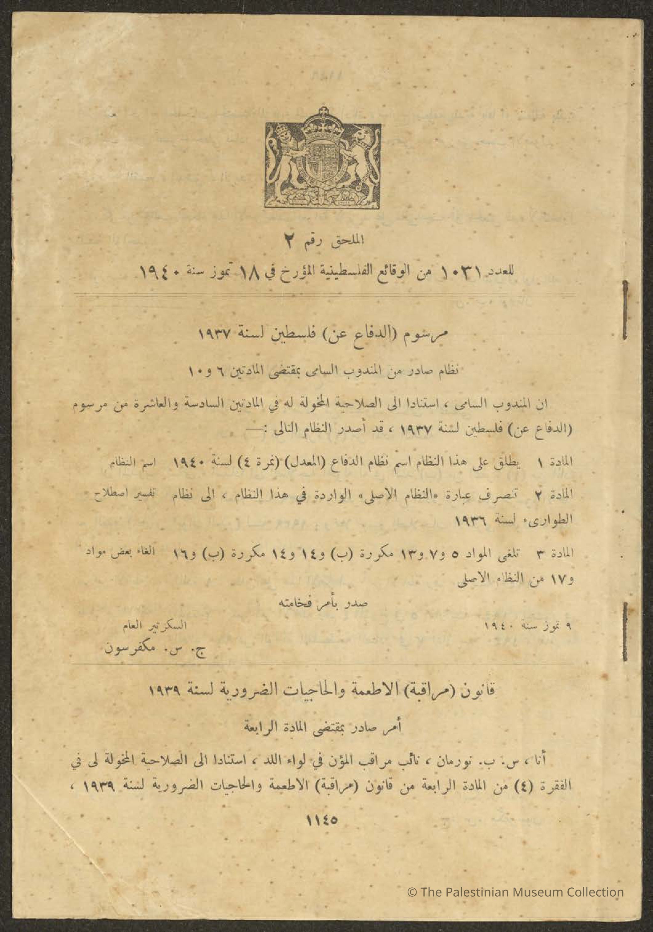 Annex No. 2 of Issue 1031 of the Palestinian Official Gazette dated July 18 1940. It contains several laws and regulations, most of which were issued by the High Commissioner or the brigade governor. The annex is 57 pages long.Dimensions