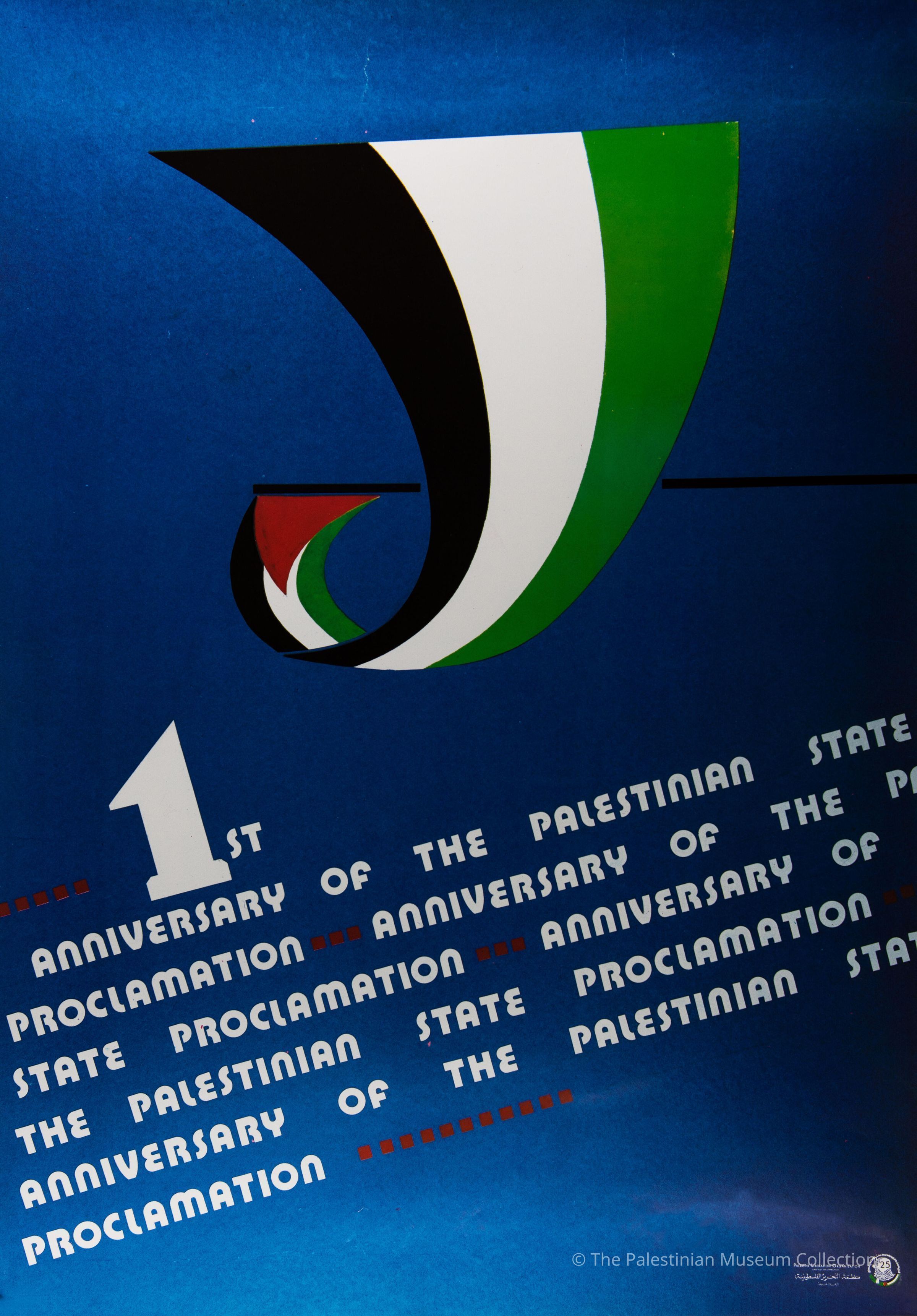 مُلصق صادر عن مجلس الإعلام الموحّد لمنظّمة التحرير الفلسطينيّة عام 1989، بمناسبة الذكرى السنويّة الأولى لإعلان دولة فلسطين. تتوفّر ضمن مجموعة المتحف نسختان أخريان من هذا المُلصق.