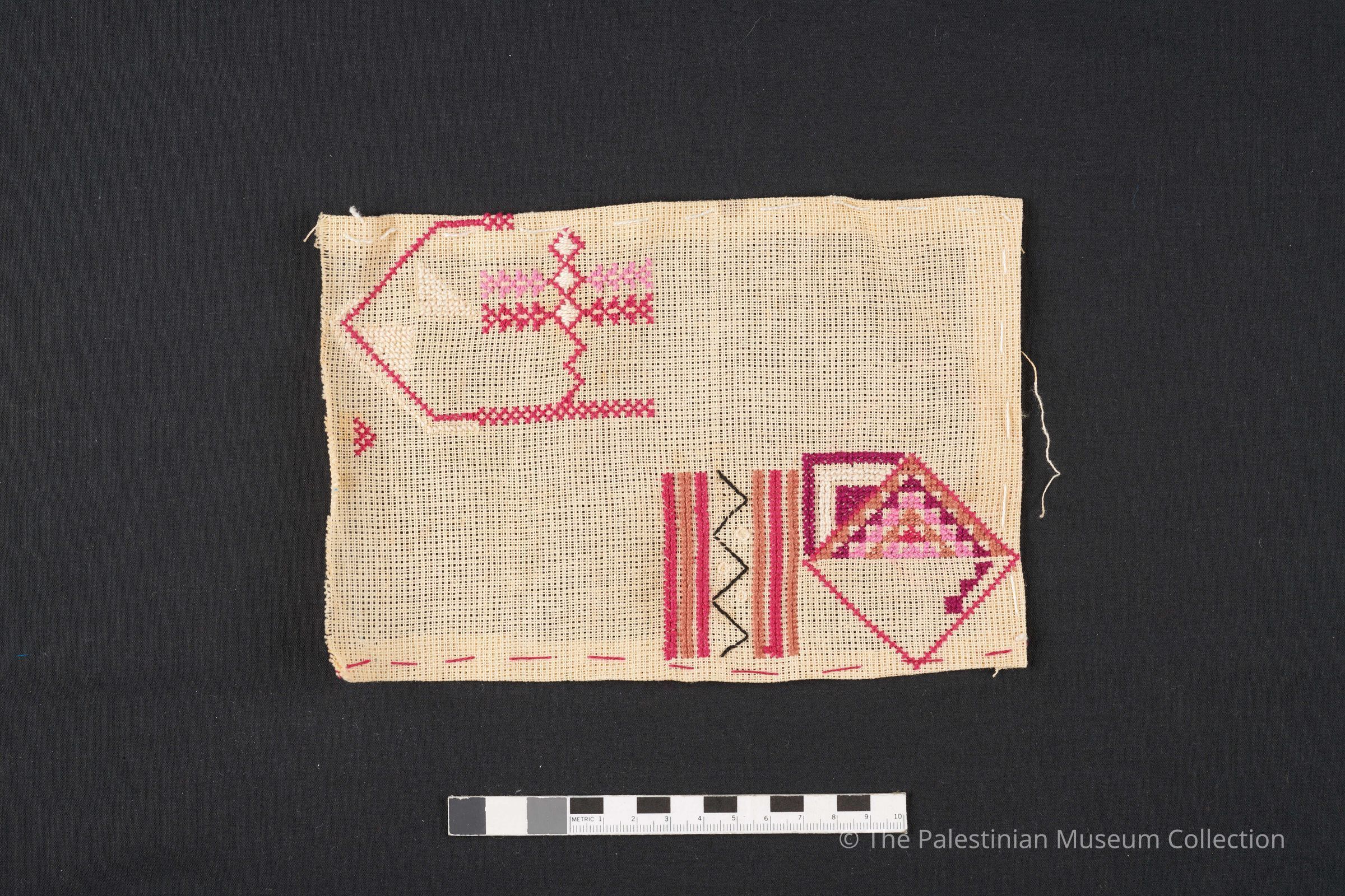 نموذج تطريز على قماش ايتامين بحرير لون زهري درجتين وابيض واحمر واسود وبرتقالي عليها رسومات متعددة منها السنبلة