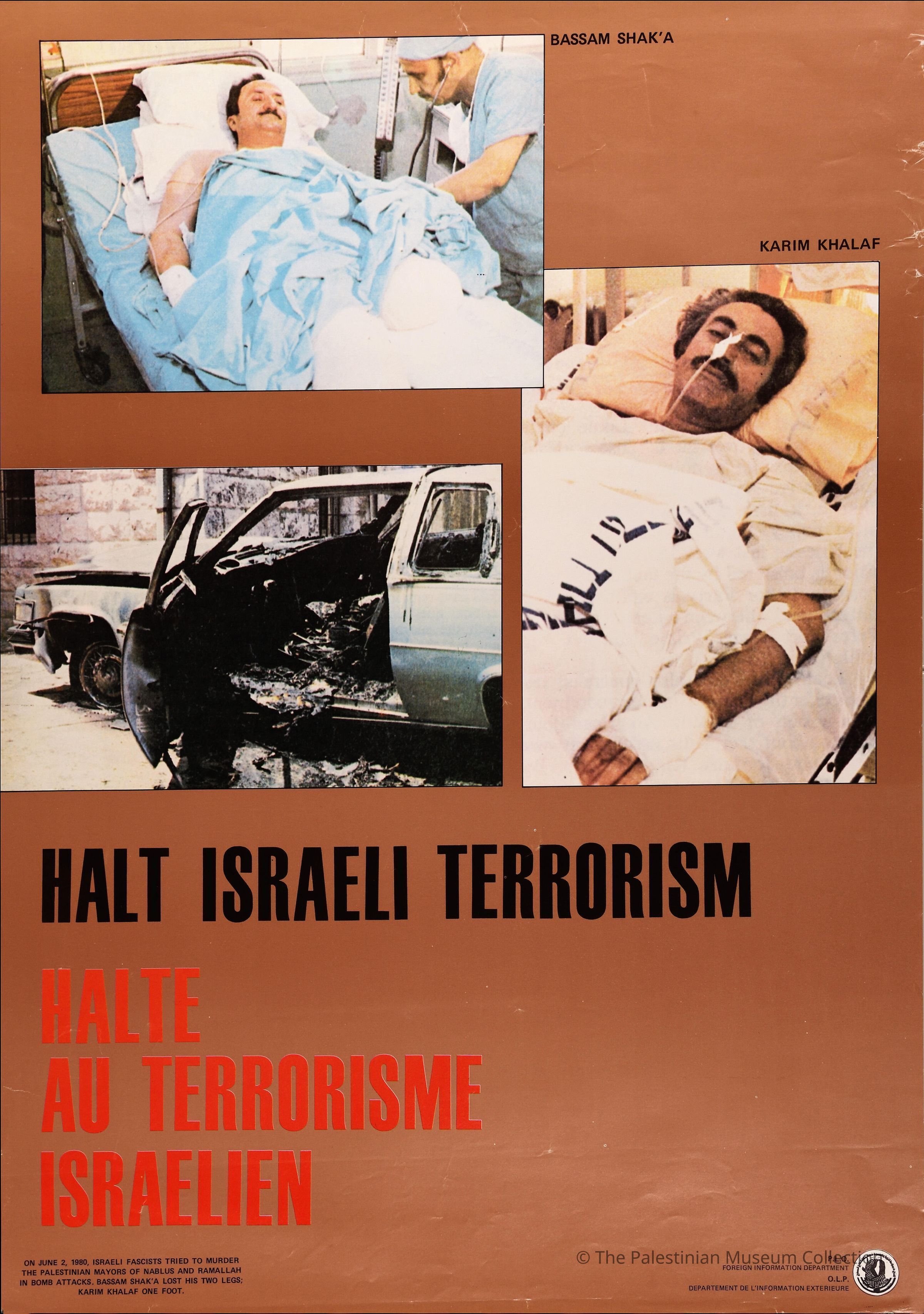 A colour poster showing photos of Bassam al-Shaka'a and Karīm Khalaf in the hospital upon the attempt to assassinate them while they were in a car. The attempt was organized by the TNT Organization; Terrorism for Terrorism. Bassam al-Shaka'a lost both legs whereas Karīm Khalaf lost only one.
