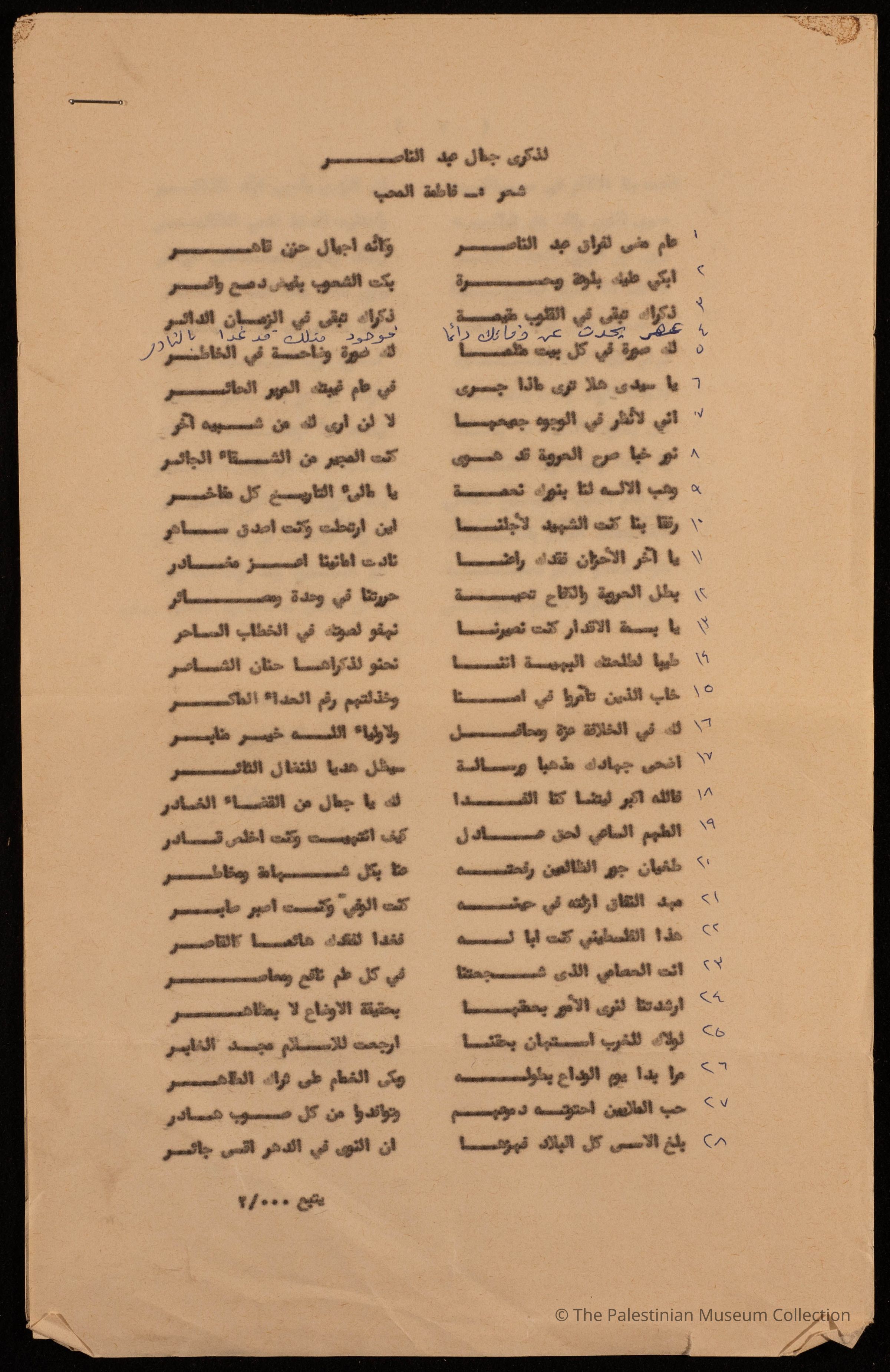 مخطوطة قصيدة بقلم فاطمة المحب لذكرى جمال عبد الناصر، مكونة من صفحتين ولا تحمل أية بيانات عن تاريخ كتابتها