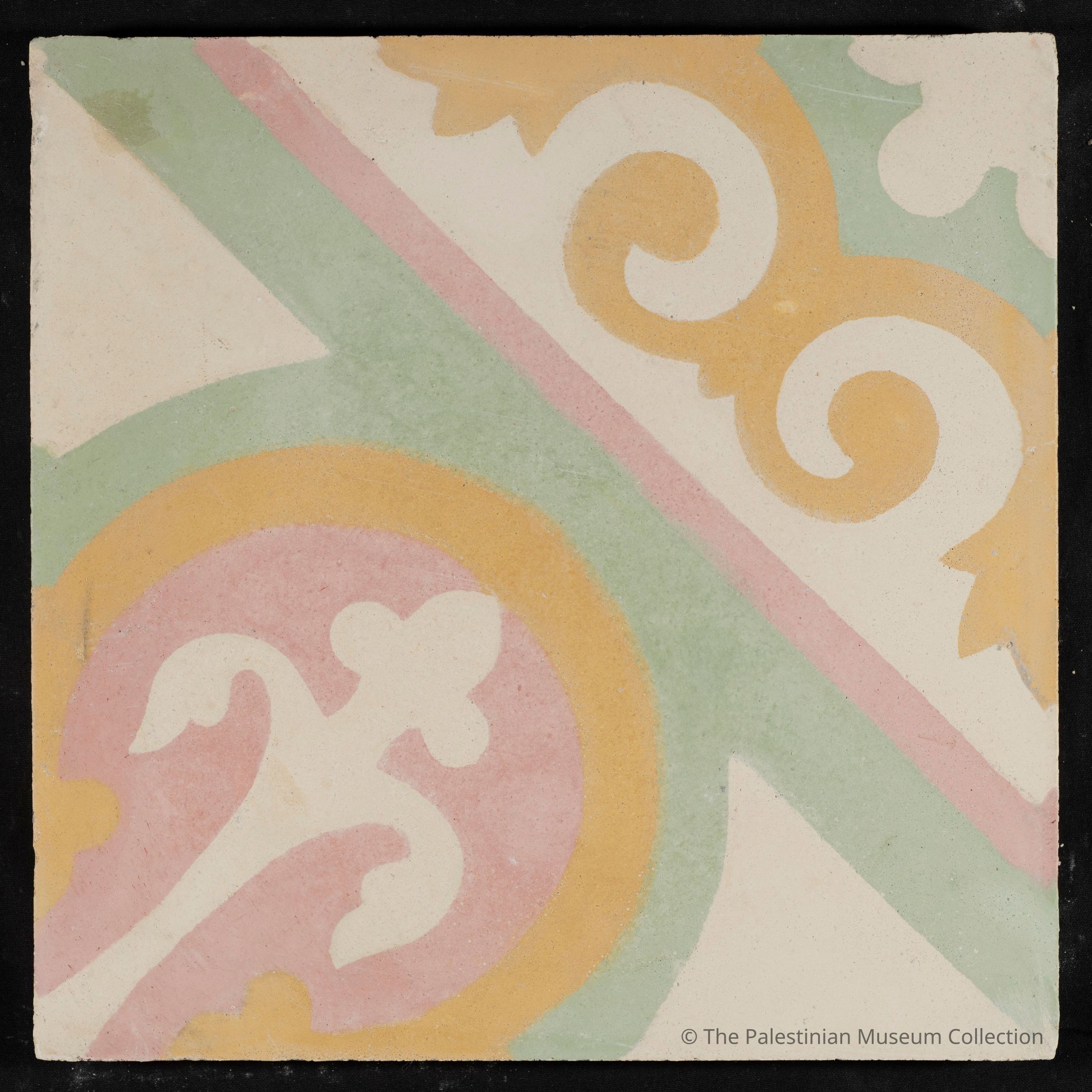 بلاطة إسمنتيّة ملوّنة بحجم 20 × 20 سم، وهي نموذج حديث سُكبت في قالب يمتلكه مصنع أصلان للبلاط في نابلس يعود إلى أربعينيات القرن العشرين.Made/Created