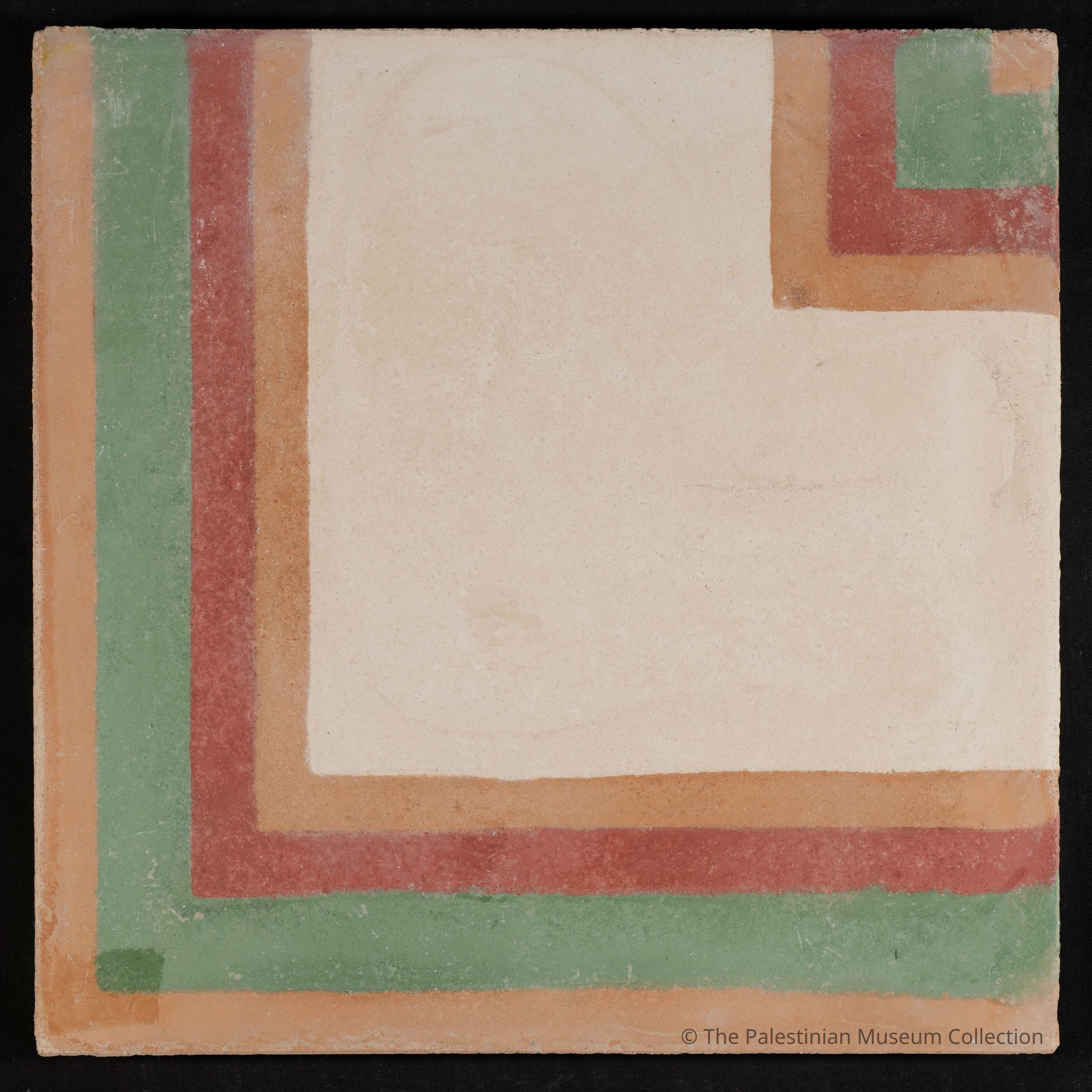 A 20 × 20 cm coloured cement tile featuring the "Corner of Zunnar Al-Huzooz (Lines Border)" design. This tile is a contemporary reproduction, cast using an original mold from the Aslan Tile Factory in Nablus, which dates back to the 1890s.Made/Created