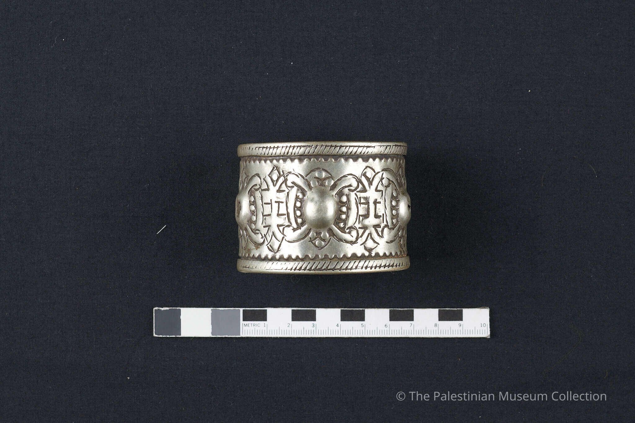 A broad handcrafted silver bracelet from the Hebron region, bearing inscriptions of shapes resembling a turtle, a frog, or a spider. It is clasp-less and has eye-like protrusions. This bracelet was used to indicate that the woman wearing it was breastfeedingMade/Created