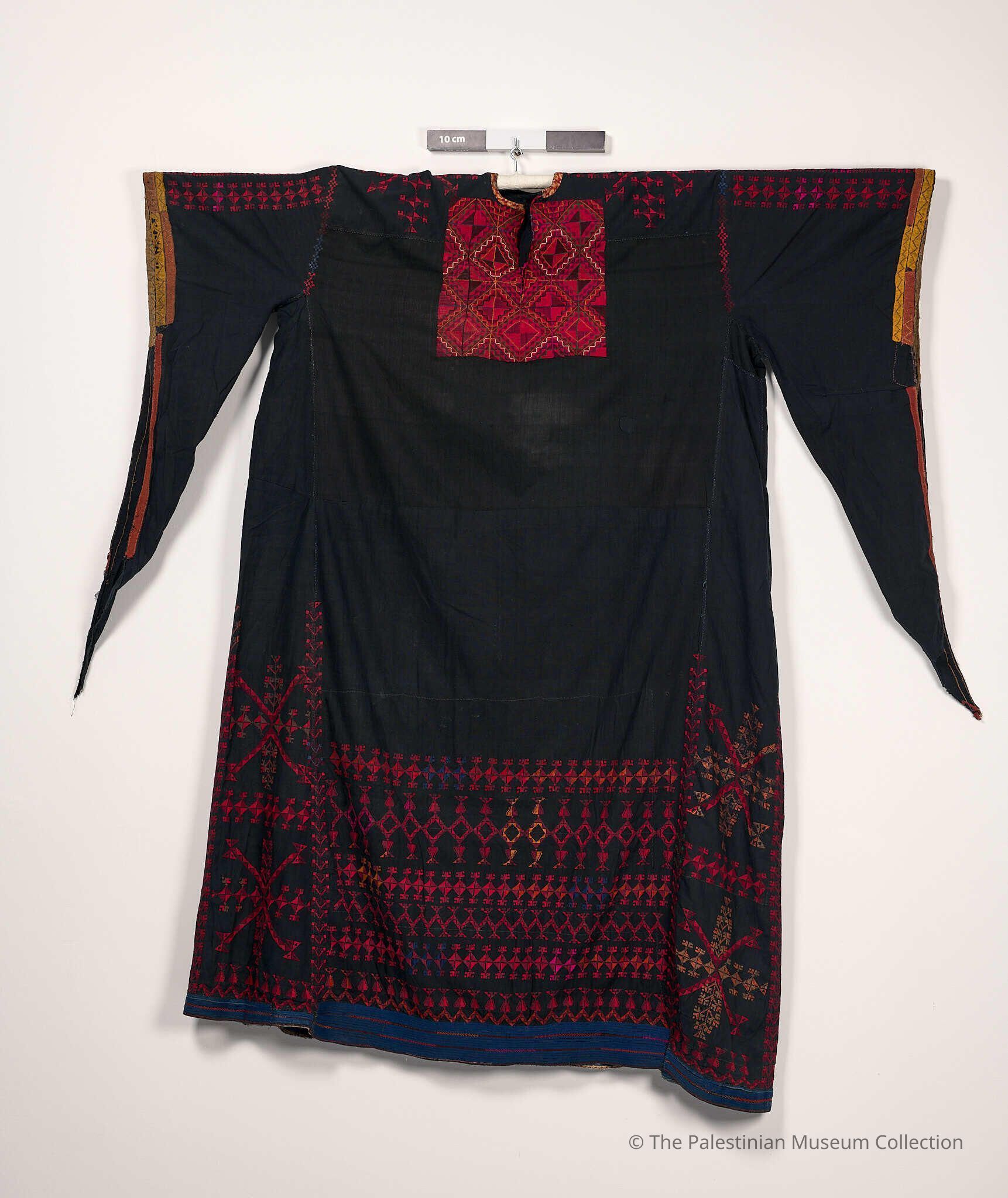 A thobe (dress) from the Bir al-Sabi’ area made of black linen and cotton and embroidered with the Fallahi (peasant) cross stitch made of predominately red silk thread overlapping with blue, yellow, and green colours. The chest panel of the thobe is adorned with heavy tatreez (embroidery) made up of geometric shapes, as are the shoulders and the mradan (long triangular sleeves). The lower front panel of the thobe is embroidered with broad stitch patterns made up of geometric shapes, as are the sides (al-Banayiq), which are connected with the tatreez of the front and back areas. The perimeter of the lower area of the thobe was embroidered with the dense tihshaya filling stitch, the stitch type used in all thobes from the Bir al-Sabi’ area.Made/Created