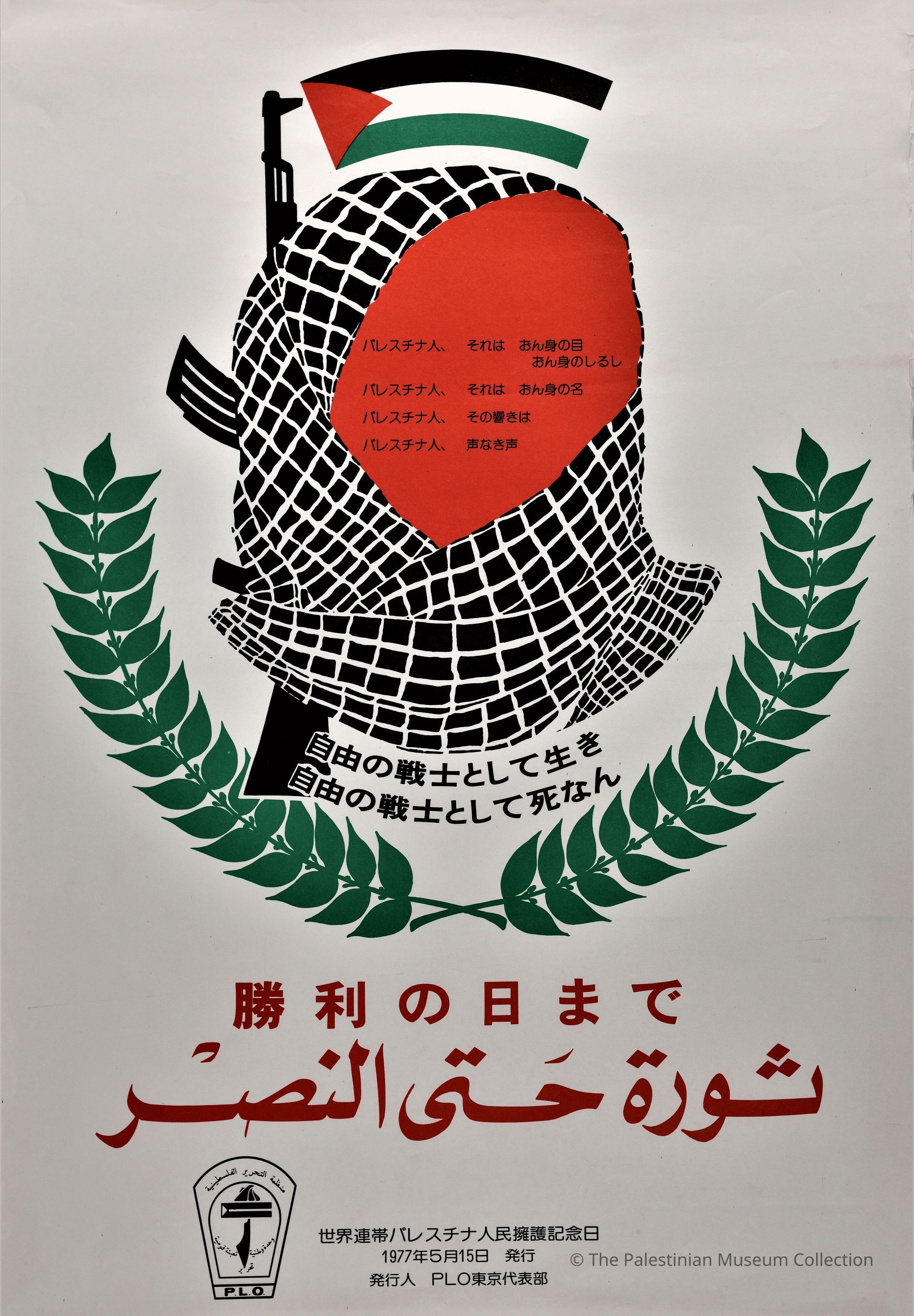 A colour poster showing the face of a masked man with a rifle behind him. The Palestinian flag is seen on the top whereas two olive branches are seen on the bottom.Dimensions