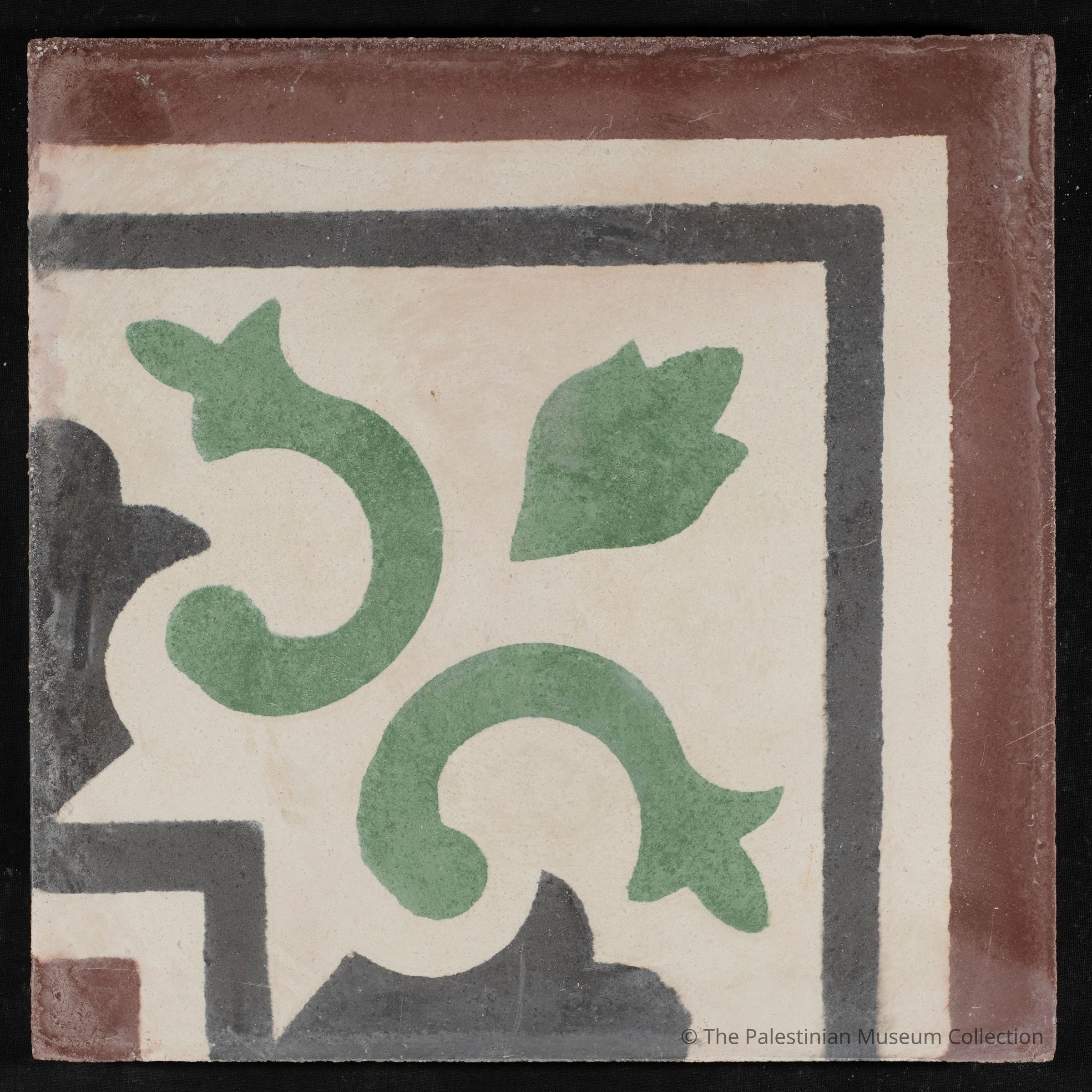 A 20 × 20 cm coloured cement corner tile of the Zunnar (border). This tile is a contemporary reproduction, cast using an original mold from the Aslan Tile Factory in Nablus.Made/Created