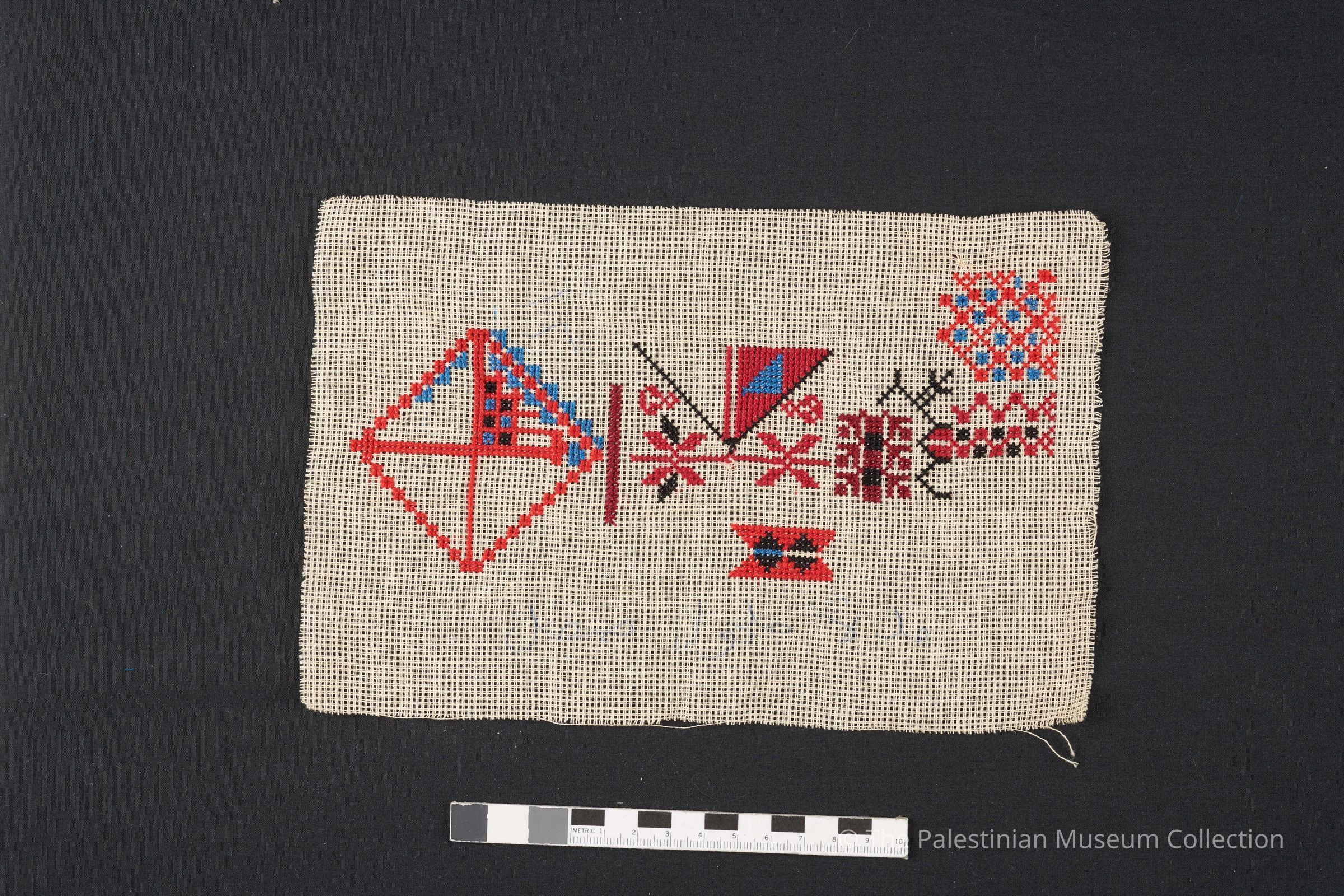 نموذج تطريز على قماش ايتامين بحرير لون احمر وازرق واسود برسمات متعددة