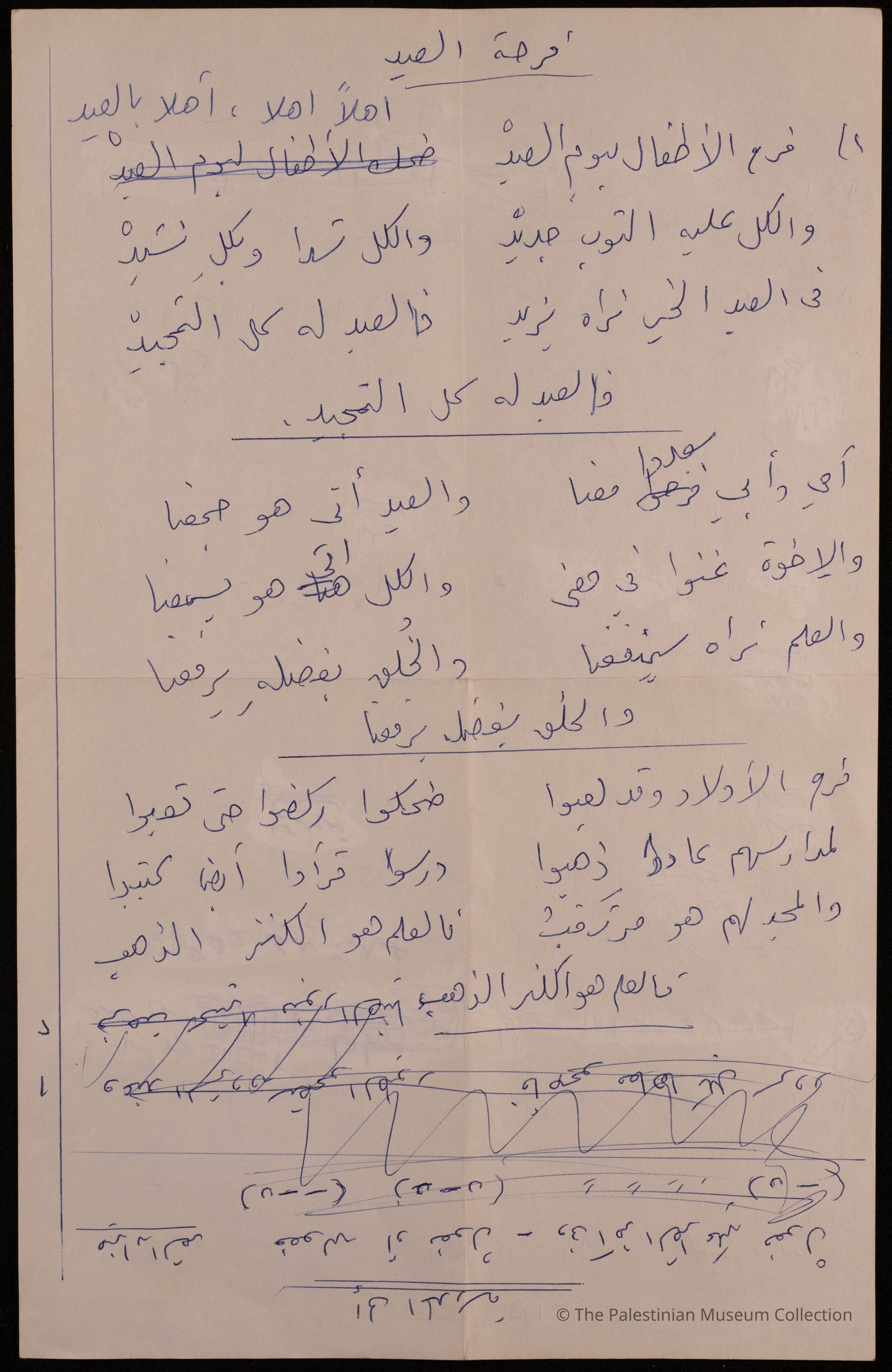 مخطوطة قصيدة باللغة العربية بعنوان " فرحة العيد" للشاعرة فاطمة المحب، ولا تحمل الوثيقة اشارة الى تاريخ كتابتها .