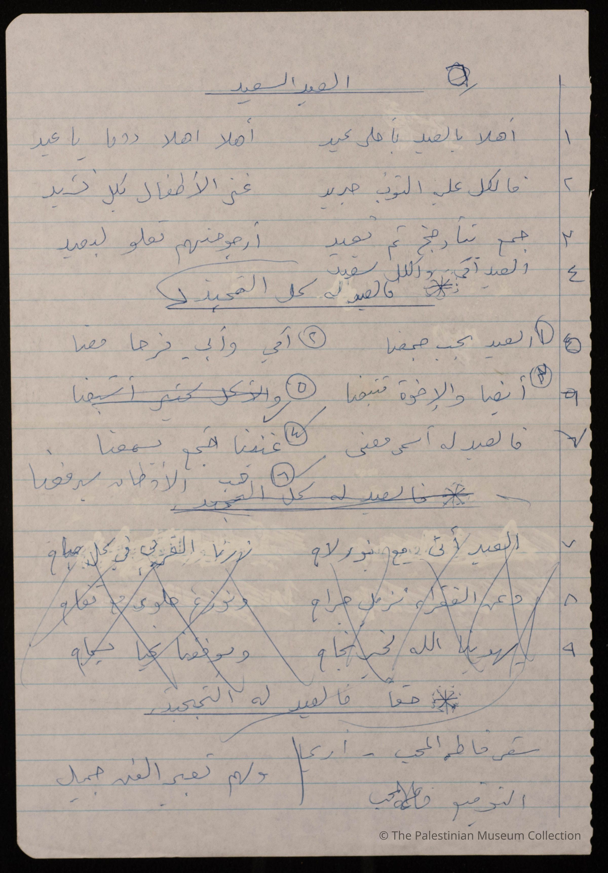 مخطوطة قصيدة باللغة العربية بعنوان " العيد السعيد" للشاعرة فاطمة المحب، ولا تحمل الوثيقة اية اشارة الى تاريخ كتابتها .