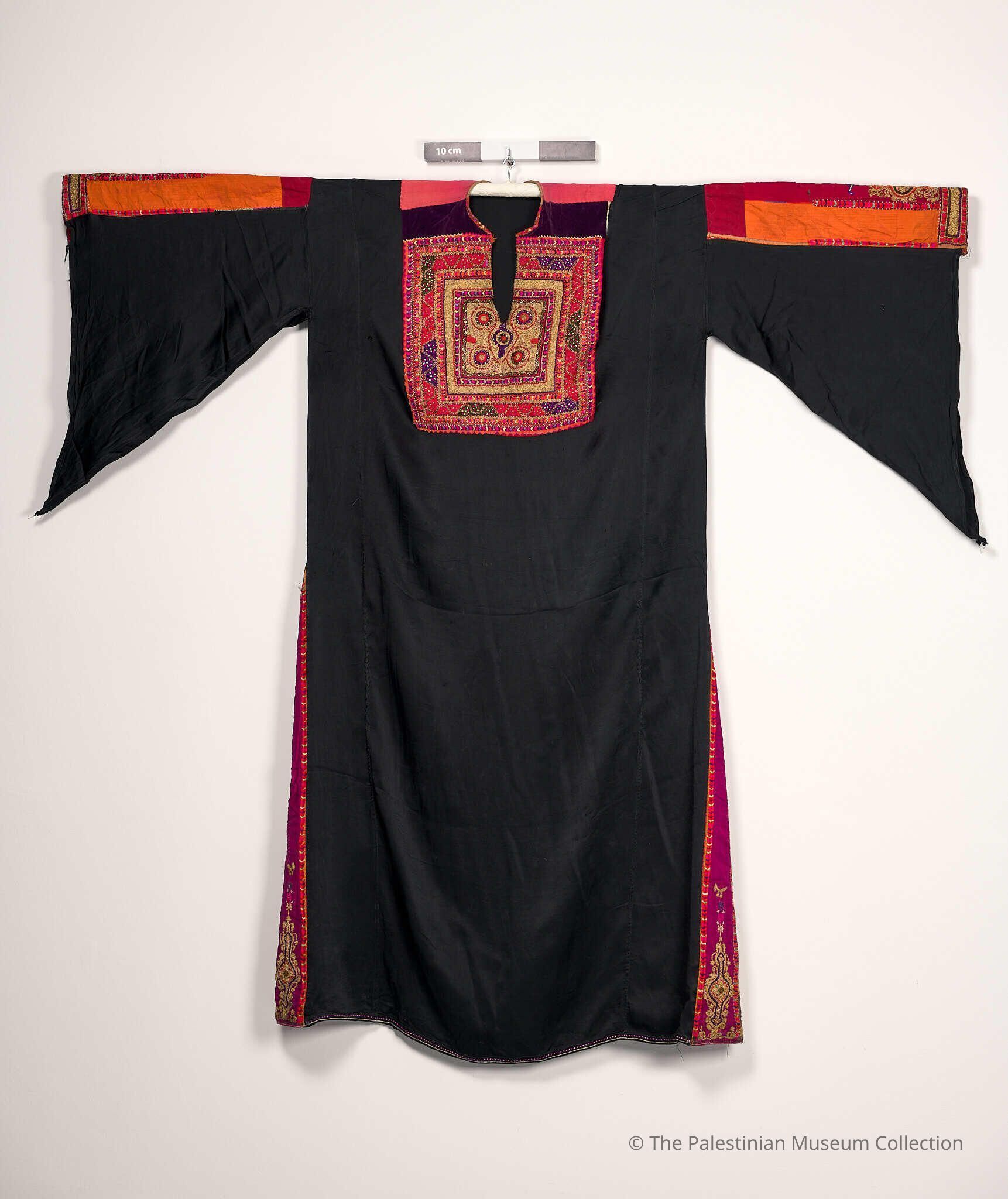 A Malak (king) thobe (dress) from Bethlehem. It is made of black silk fabric blended with linen (habar) and embroidered red silk threads and gilded qasab (metallic couching cord) with a Tahriri (couching) stitch. The chest panel of the thobe is made of silk and velvet and embroidered with plant and geometric shapes in primarily red silk threads. The shoulders and the back panel of the thobe (the upper back neckline) bear no tatreez (embroidery). The sleeves are mradan (long triangular sleeves), with part made of red and orange silk (heremzi), embroidered with a Tahriri stitch in geometric shapes alongside manajil and watch motifs. The front and back panel of the thobe have no tatreez. The sides (al-Banayiq) are made of purple silk (heremzi) and embroidered with gilded qasab using a Tahriri stitch in geometric shapes and manajil and watch motifs. The tail of the thobe is adorned with a stitch pattern of plant and geometric shapes and watch motifs in red and purple threads along with gilded qasab.Made/Created