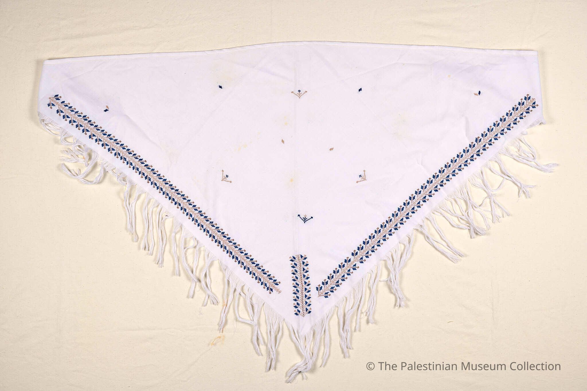 A triangular shawl which would be worn on shoulders and head. It is made of white cotton and embroidered with primarily blue silk threads using a Fallahi (peasent) cross stitch. It features a tatreez of plant shapes and tassels dangling on its end.Made/Created