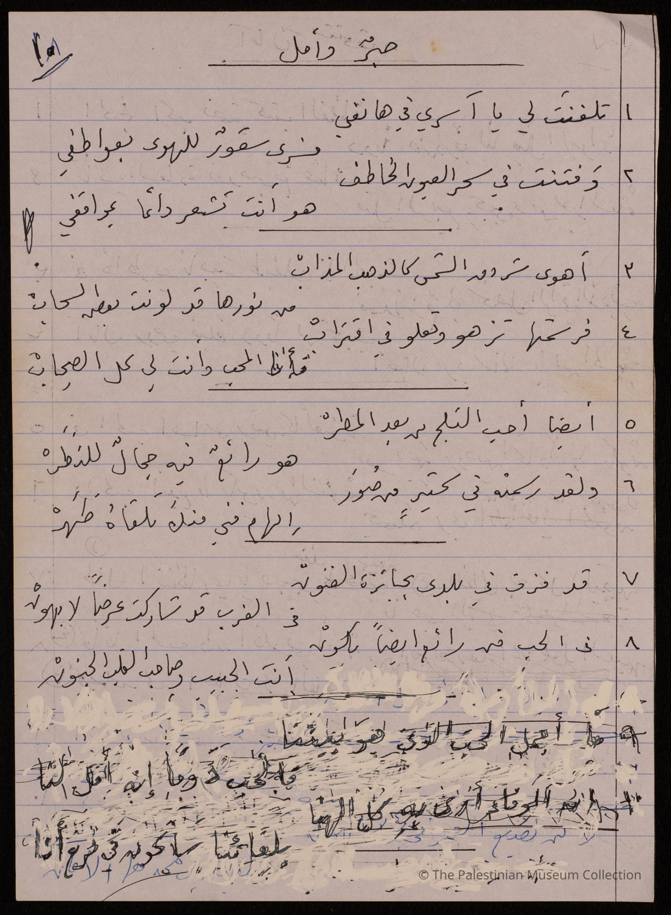 مخطوطة قصيدة باللغة العربية بعنوان" صبر وأمل" للشاعرة فاطمة المحب، ولا تحمل الوثيقة اية اشارة الى تاريخ كتابتها.