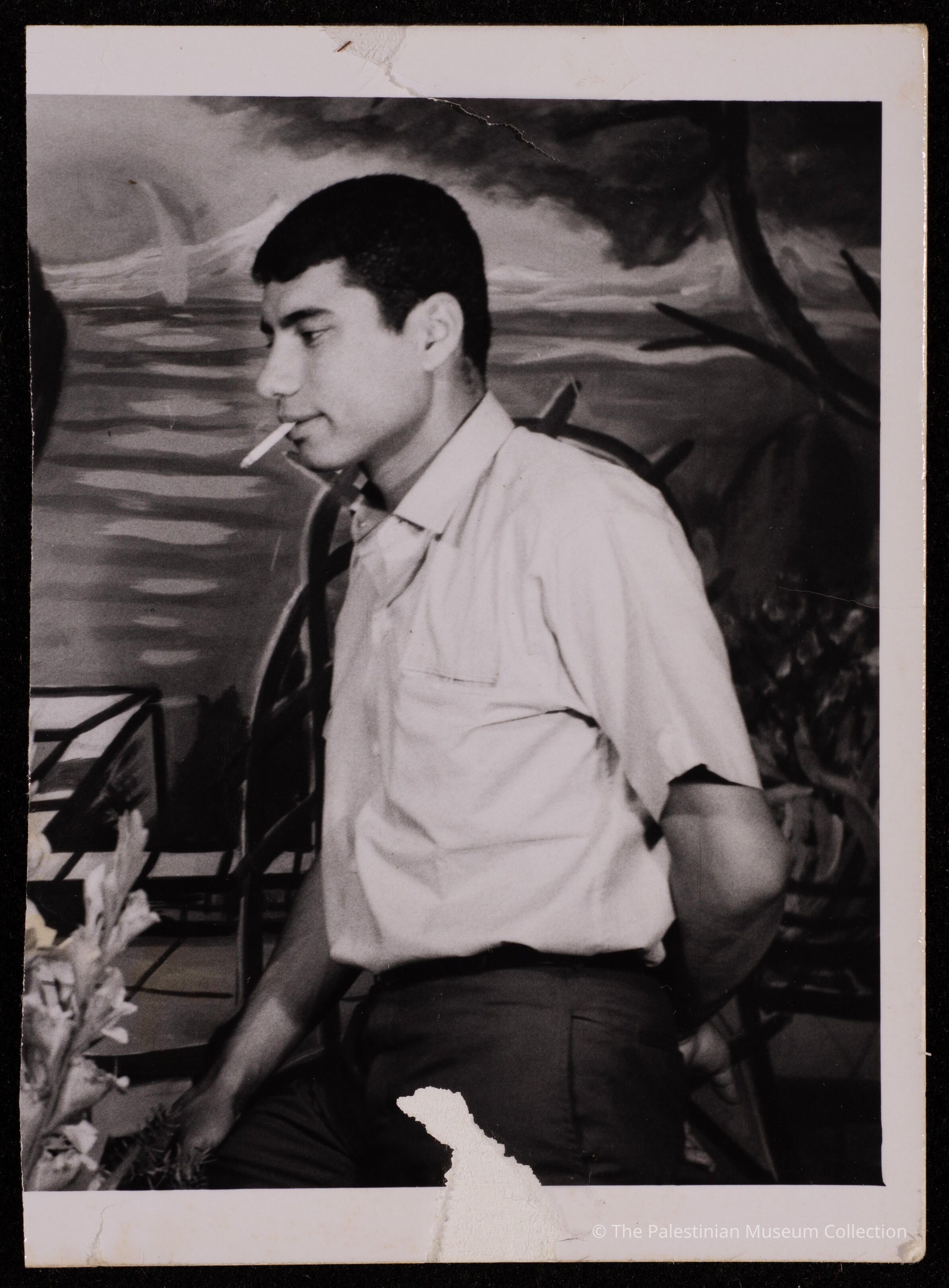 صورةغير ملونة، يظهر فيها علي فودة يرتدي قميص ابيض ويدخن.