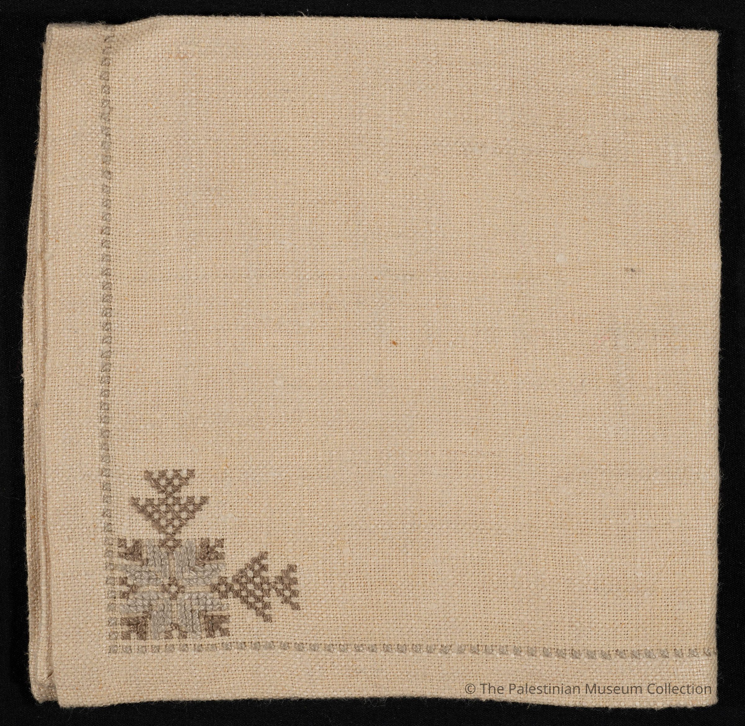 A table napkin made of beige linen. It has a light embroidery of a plant motif on its corner using the Fallahi (peasant) cross stitch. It was produced by the Arab Refugees Handicrafts Center in Jerusalem, owned by Asia Jeries Halabi.