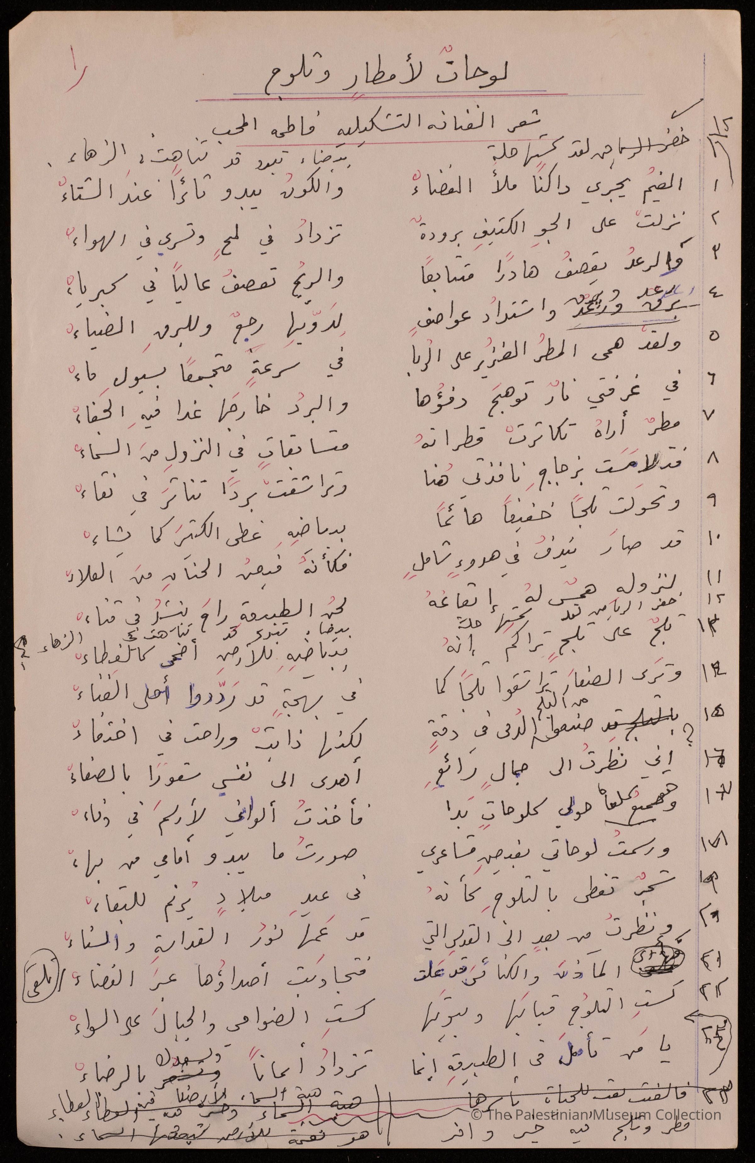 مخطوطة قصيدة باللغة العربية بعنوان" لوحات لامطار وثلوج" للشاعرة فاطمة المحب،ن ولا تحمل الوثيقة اي اشارة لتاريخ كتابتها.