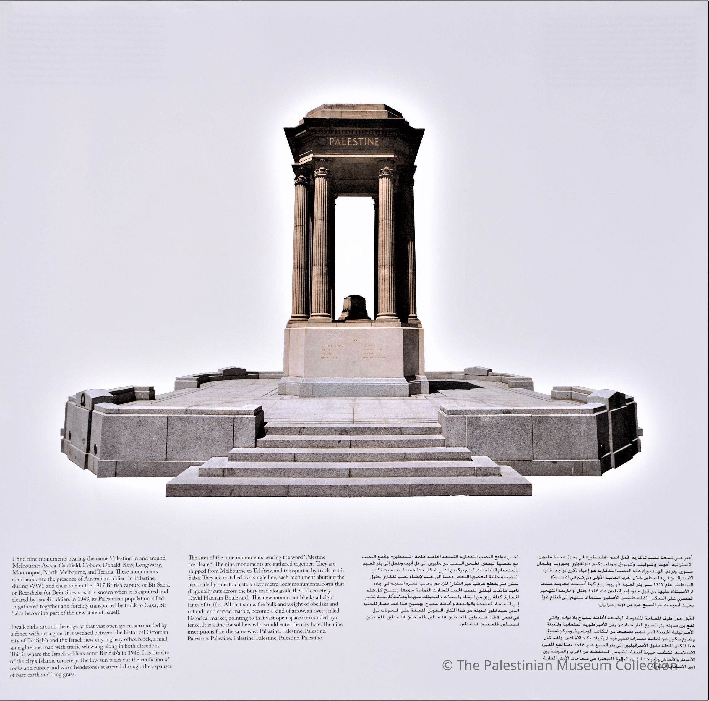 Proposition for a monument, articulated as two-sided off-set printed poster, each 50 × 50 cm, for visitors to take away, and also pasted up around Ramallah, this colour poster shows a monument commemorating the presence of Australian soldiers in Palestine during World War I and their role in the 1917 British capture of Beʾr as-Sabeʿ.