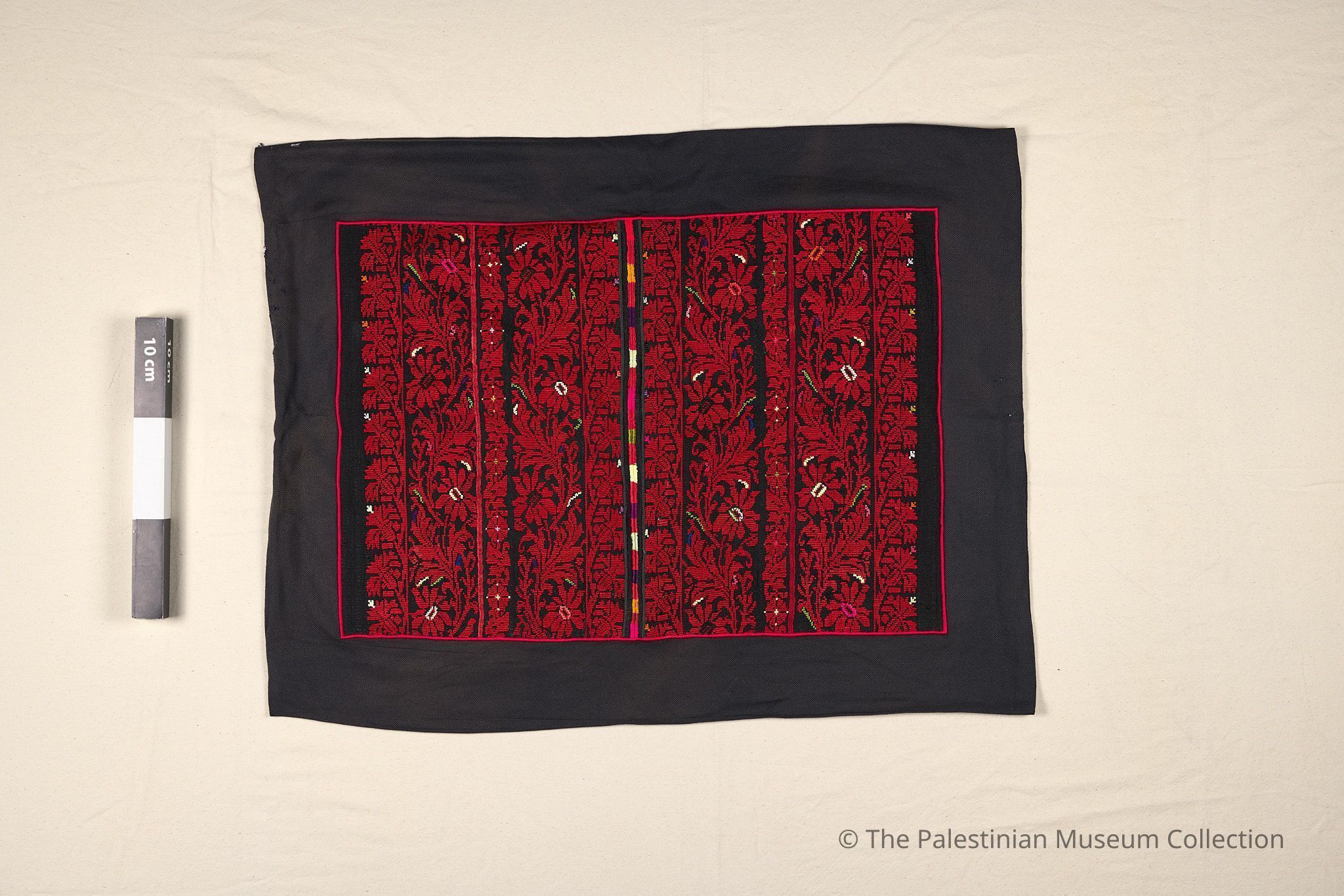 وجه مخدّة من منطقة رام الله، مستطيل الشكل، مصنوع من قماش الكتّان والقطن باللون الأسود، ومُطرّز بتطريز كثيف من الأشكال الهندسيّة والنباتيّة كالورد وعرق المناجل بقطبة الصليب الفلّاحي، واستُخدمت في تطريزه خيوط من الحرير باللون الأحمر والأخضر والأزرق والأبيض والأصفر.