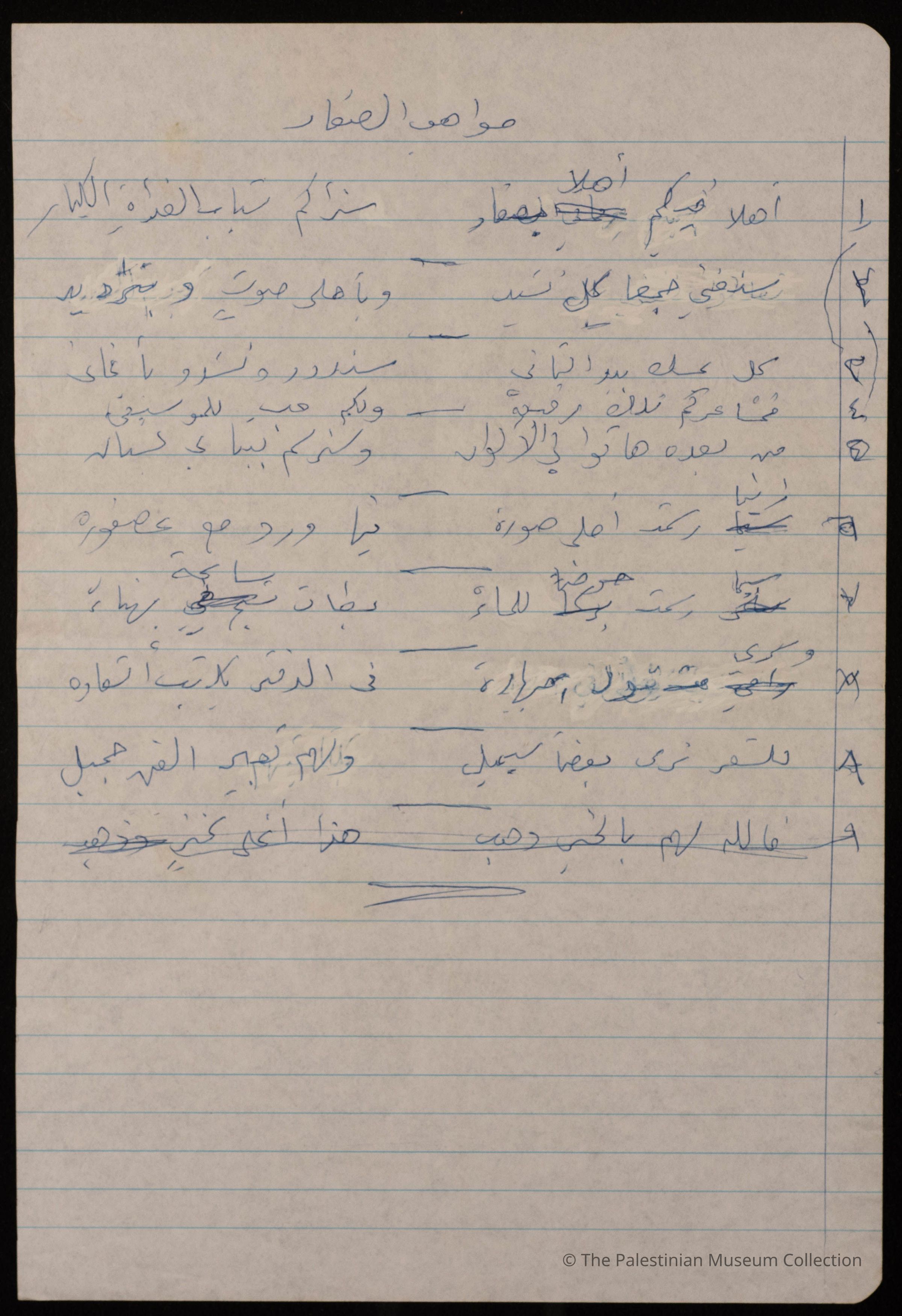 مخطوطة قصيدة باللغة العربية بعنوان " امطاروثلوج" للشاعرة فاطمة المحبنظمت في اريحا- فلسطين، ولا تحمل الوثيقة اية اشارة الى تاريخ كتابتها.