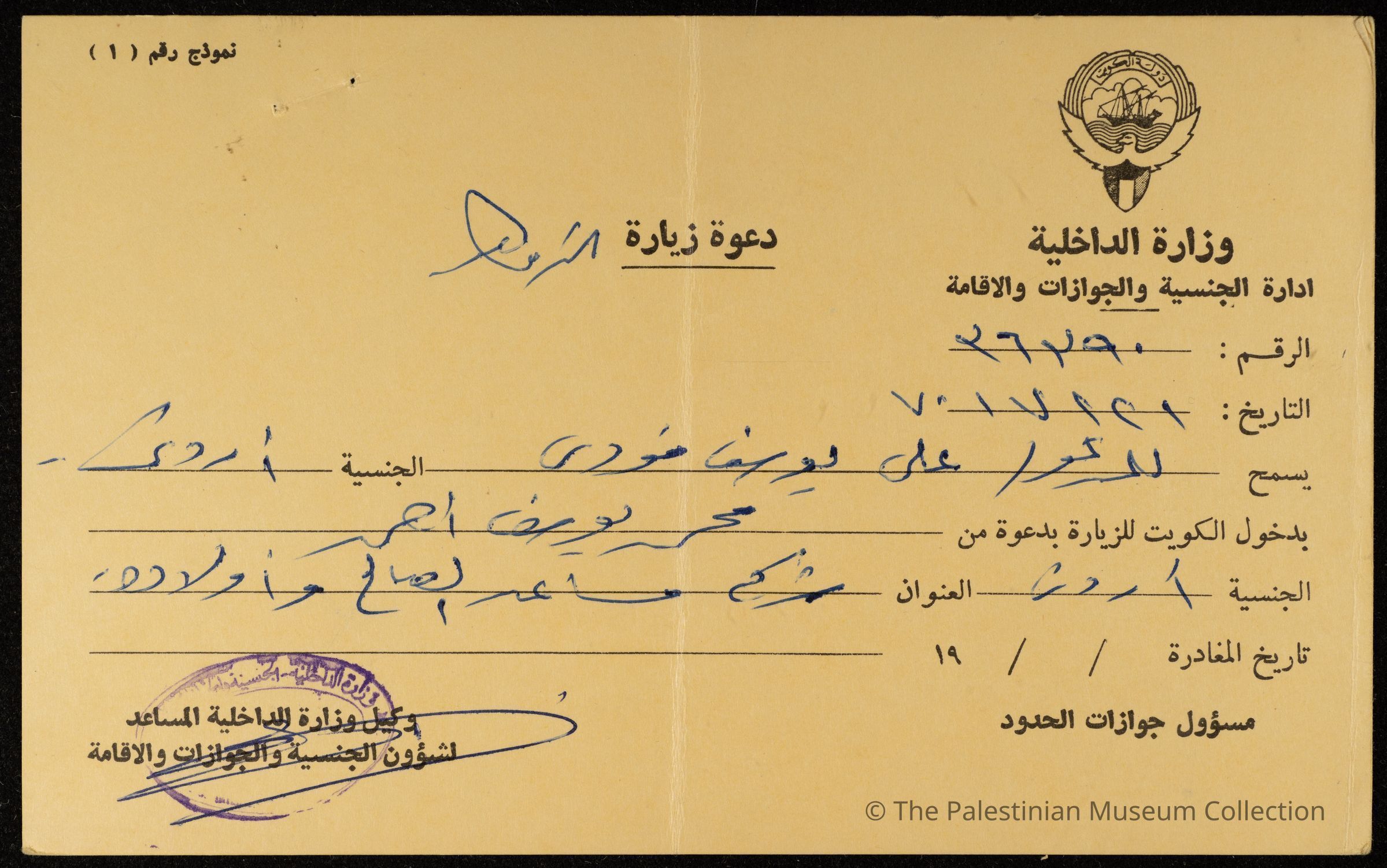 دعوة زيارة من السيد محمد يوسف فودة للسيد علي فودة، تحتوي على اذن لدخول الكويت للزيارة ومعلومات شخصية عنه.