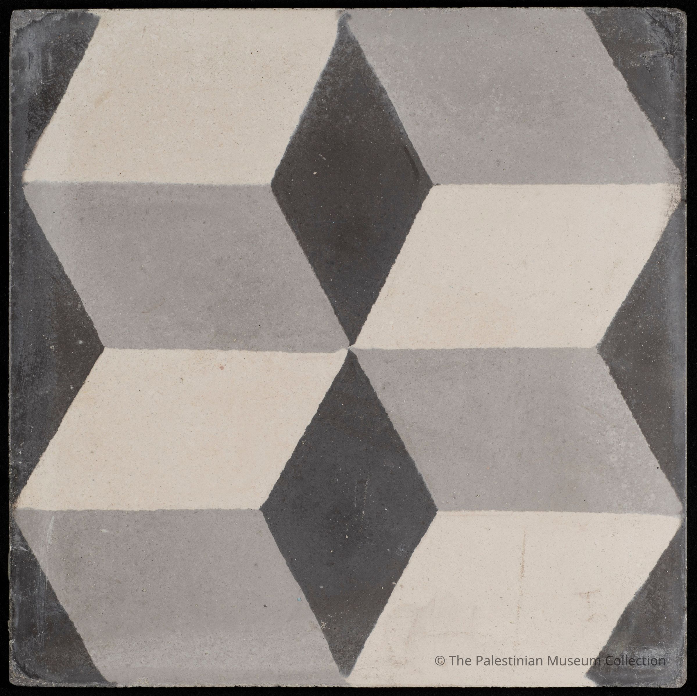 بلاطة إسمنتيّة ملوّنة بحجم 20 × 20 سم، تحمل تصميم "سجّادة البقلاوة"، وهي نموذج حديث سُكبت في قالب يمتلكه مصنع أصلان للبلاط في نابلس يعود إلى عشرينيّات القرن العشرين.