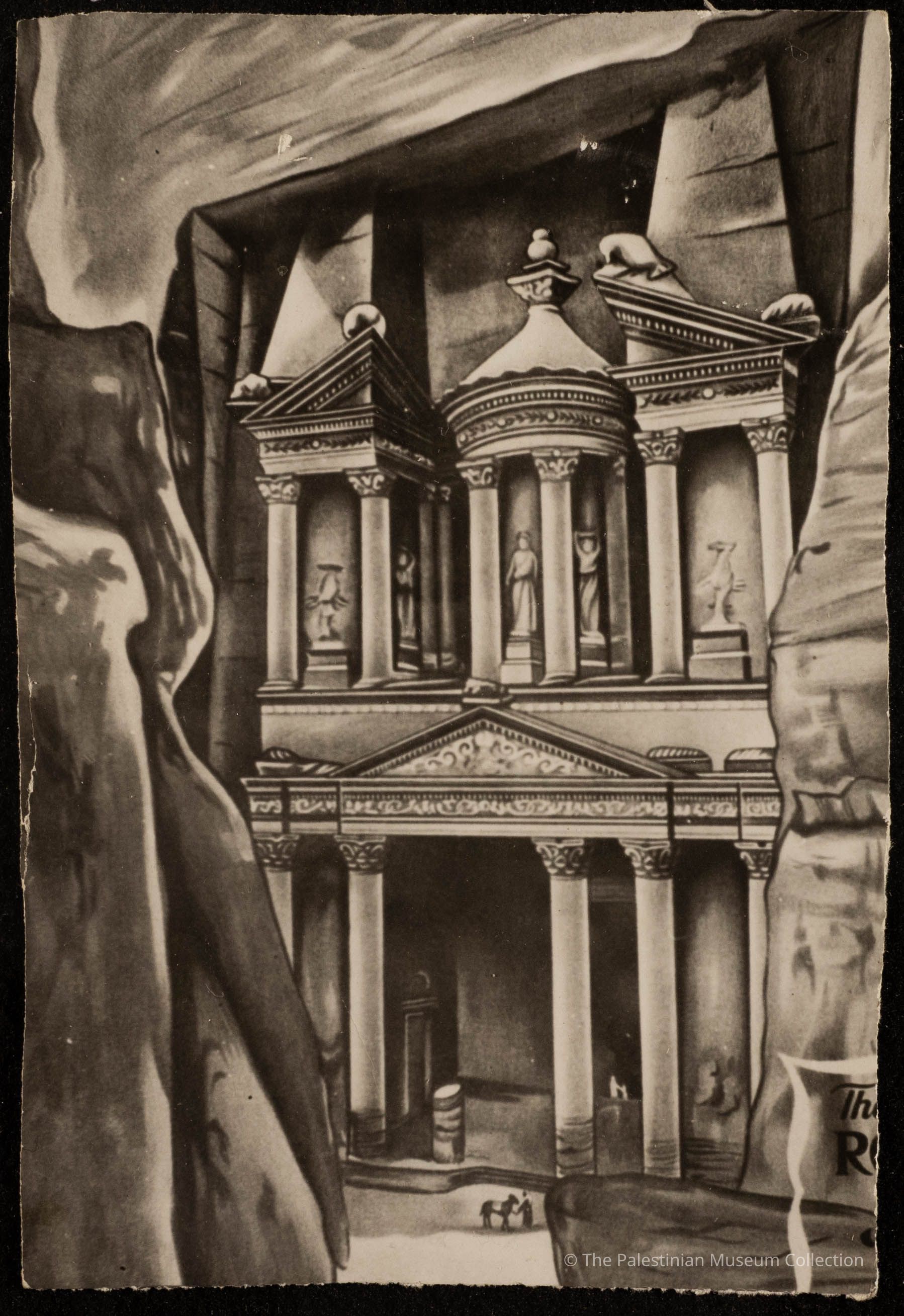 صورة عن لوحة الخزنة في البتراء، للفنانة فاطمة المحب.