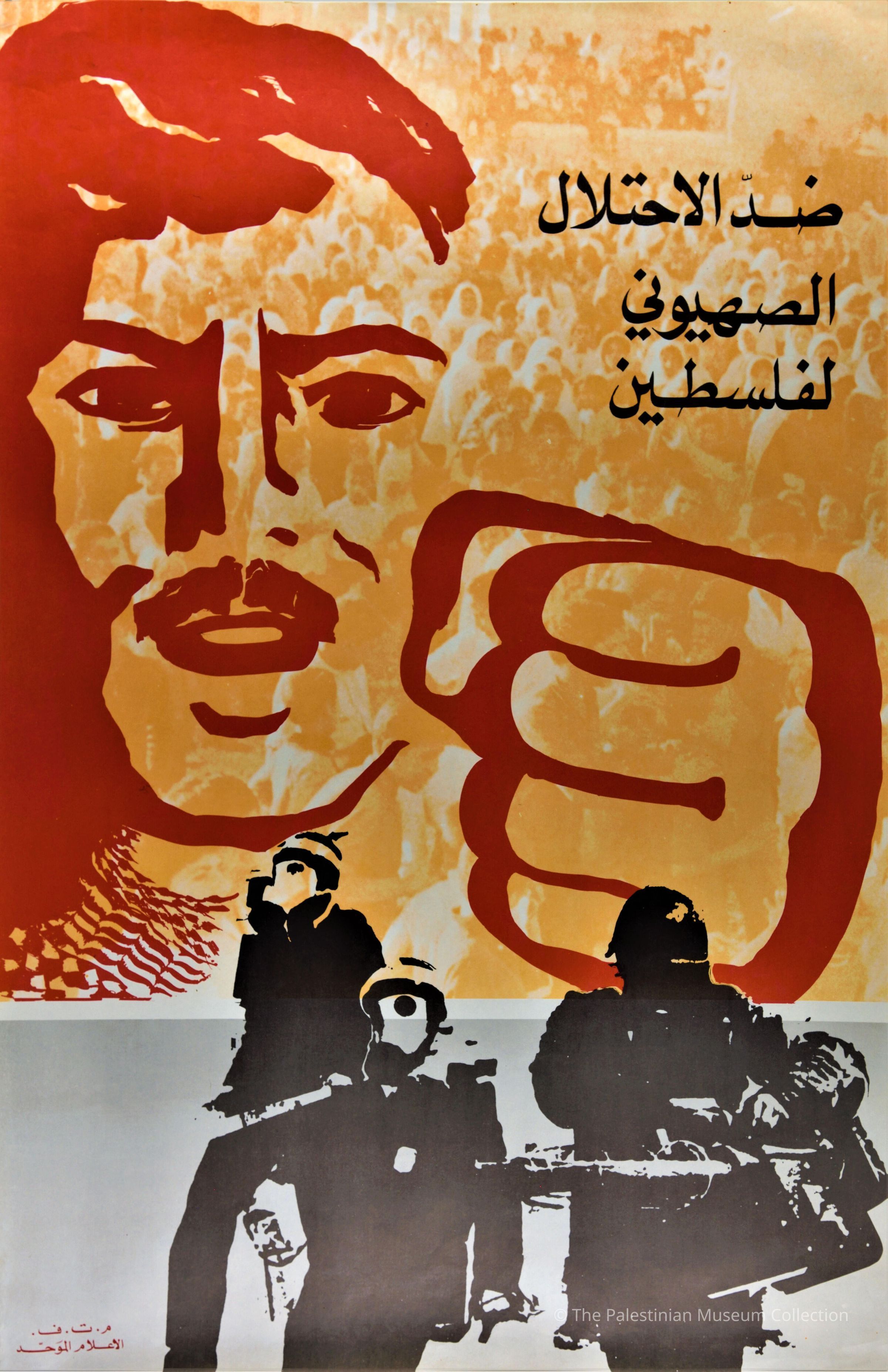 ملصق ملون، يظهر فيه رجل غاضب يرتدي الكوفية الفلسطينية على عنقه، يوجه قبضته الى الأمام، في الخلف يوجد صورة لمظاهرة ،، أسفل الملصق جنود يمسكون أسلحتهم ويرتدون أقنعة الغاز.