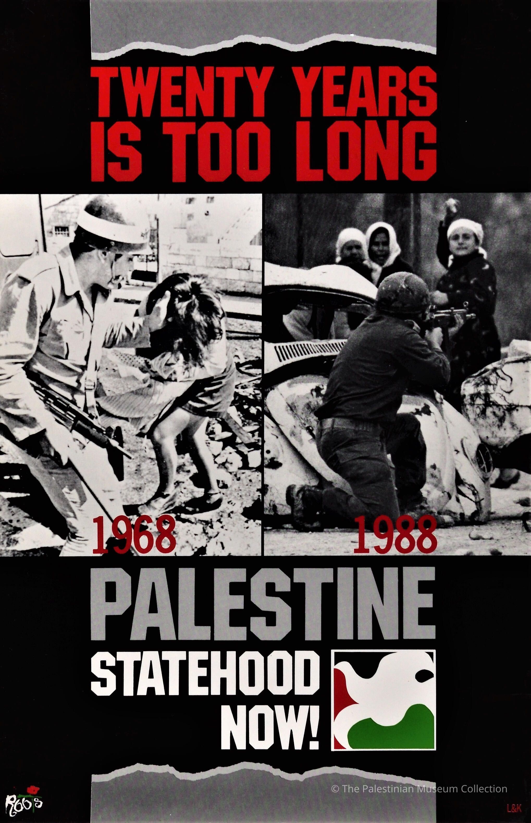 A colour poster showing two photos of the difference between the year 1968 and 1988. Both photos feature the oppression of the Israeli Occupation against Palestinian women.Dimensions