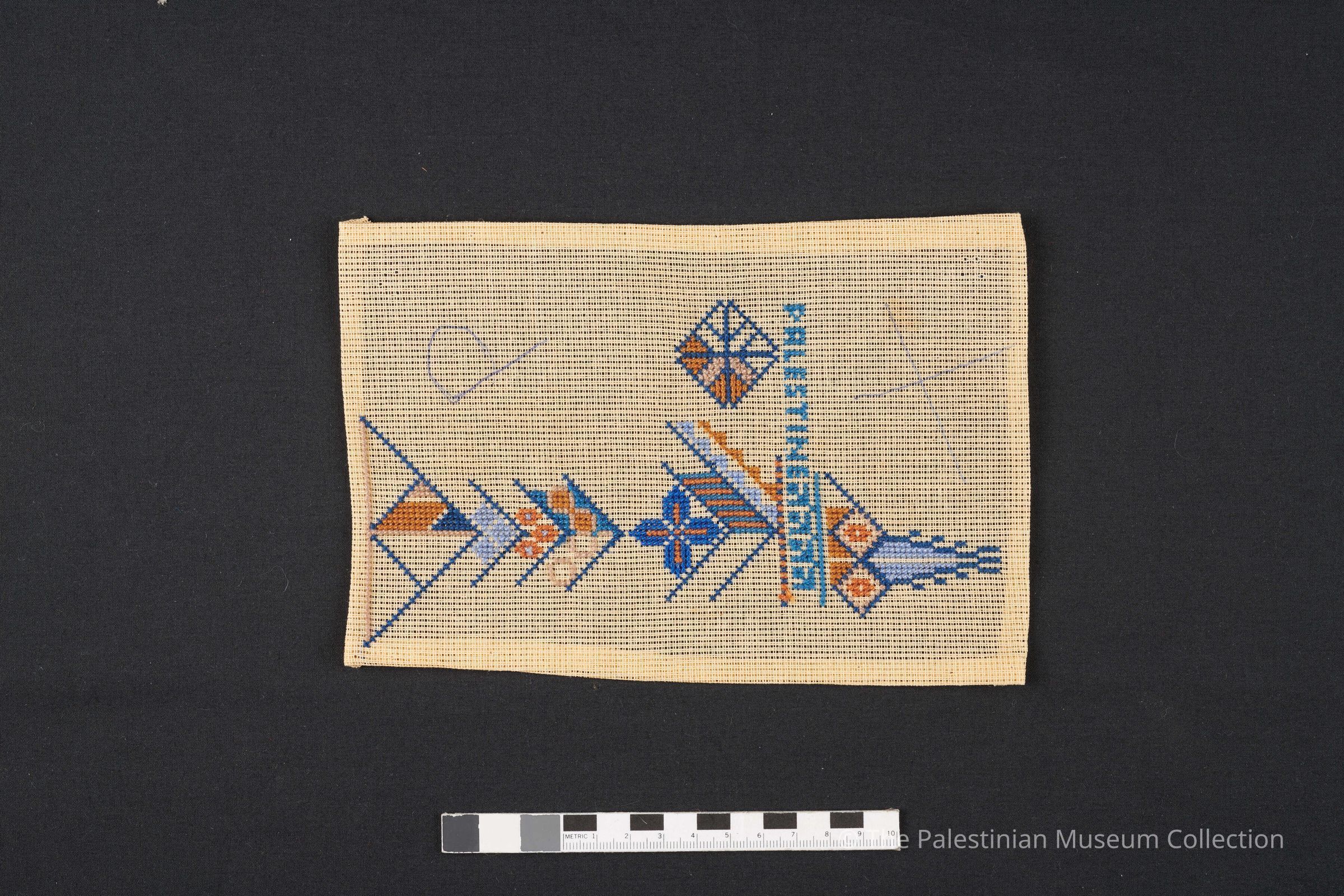 نموذج تطريز على قماش ايتامين مطرز بحرير لون ازرق وكحلي وبرتقالي عليه رسمة سرو وكلمة palestine