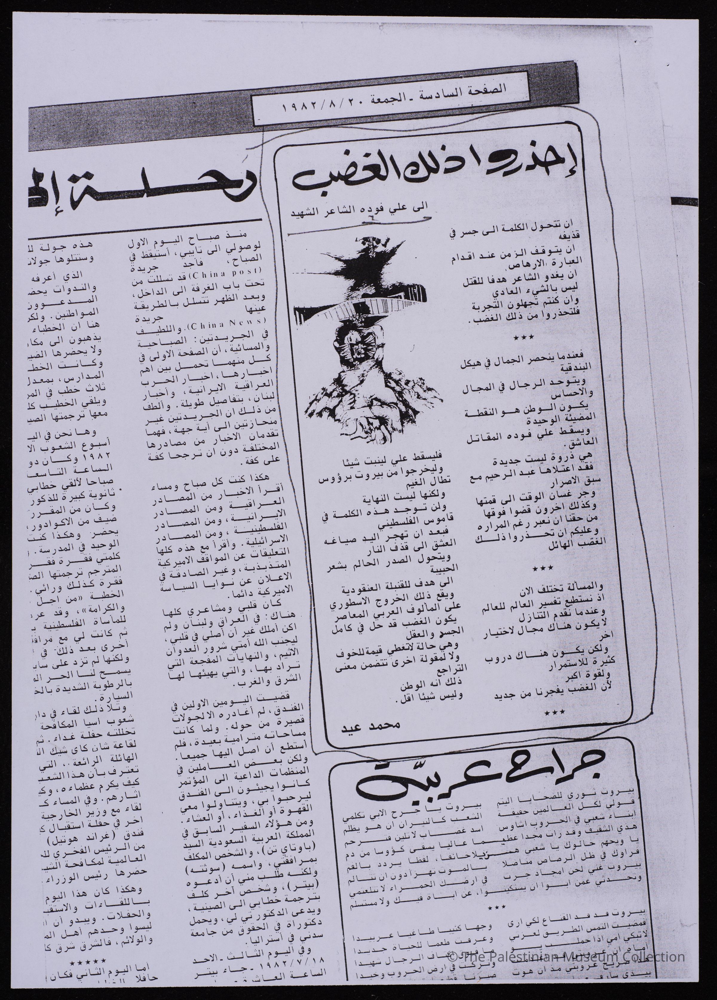 A newspaper clipping featuring an elegy by Mohamed Eid for the martyr poet Ali Foda, titled "Beware of That Wrath."