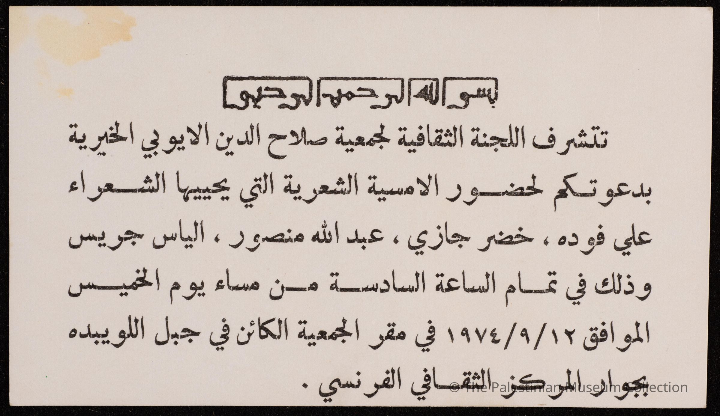 دعوة من اللجنة الثقافية لجمعية صلاح الدين الايوبي الخيرية، تحتوي على دعوة لحضور امسية شعرية يحيها الشعراء علي فودة، خضر جازي، عبدالله منصور، الياس جريس في مقر الجمعية الكائن في جبل اللويبده بجوار المركز الثقافي