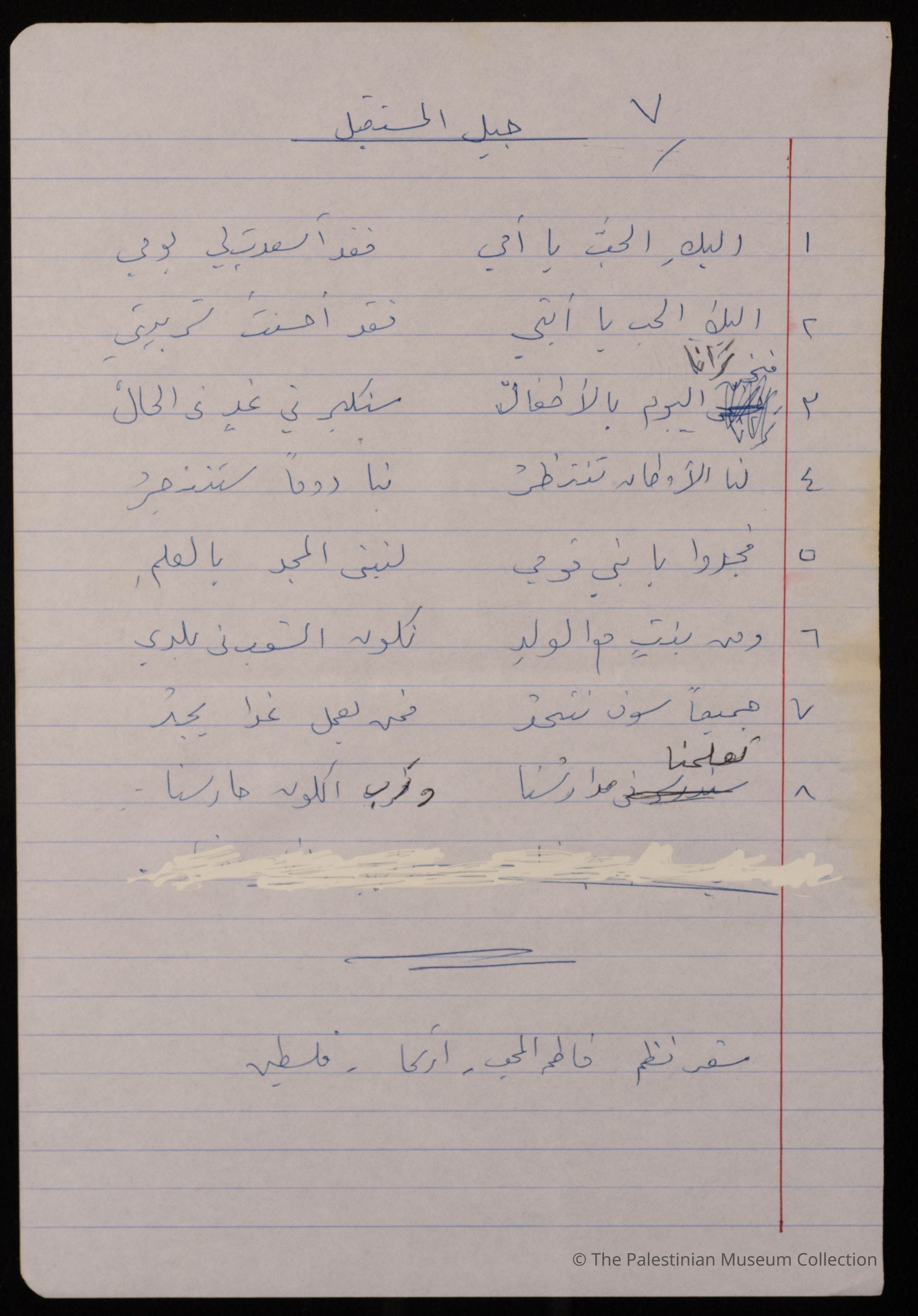 مخطوطة قصيدة باللغة العربية بعنوان جيل المستقبل" للشاعرة فاطمة المحب،نظمت في اريحا- فلسطين ولا تحمل الوثيقة اية اشارة الى تاريخ كتابتها.