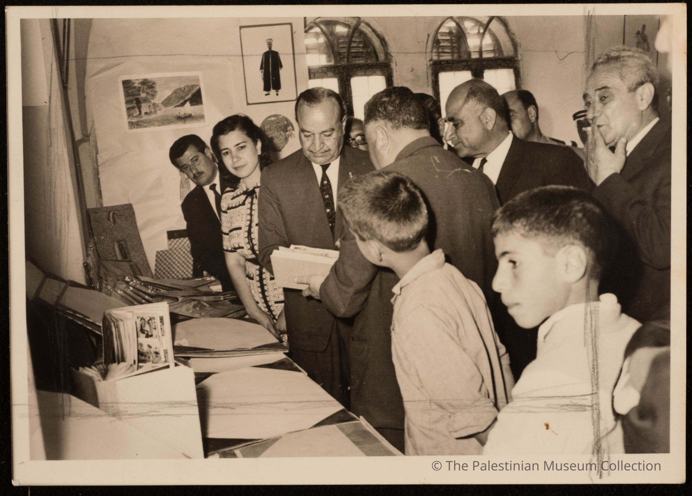 صورة الفننة فاطمة المحب والطفل عمر الجلاد ابن شقيقتها الدكتورة زينب المحب برفقة اخرين ، في معرض وسائل الايضاح الذي اشرفت عليه الفنانة فاطمة المحب في احد المدارس في القدس.