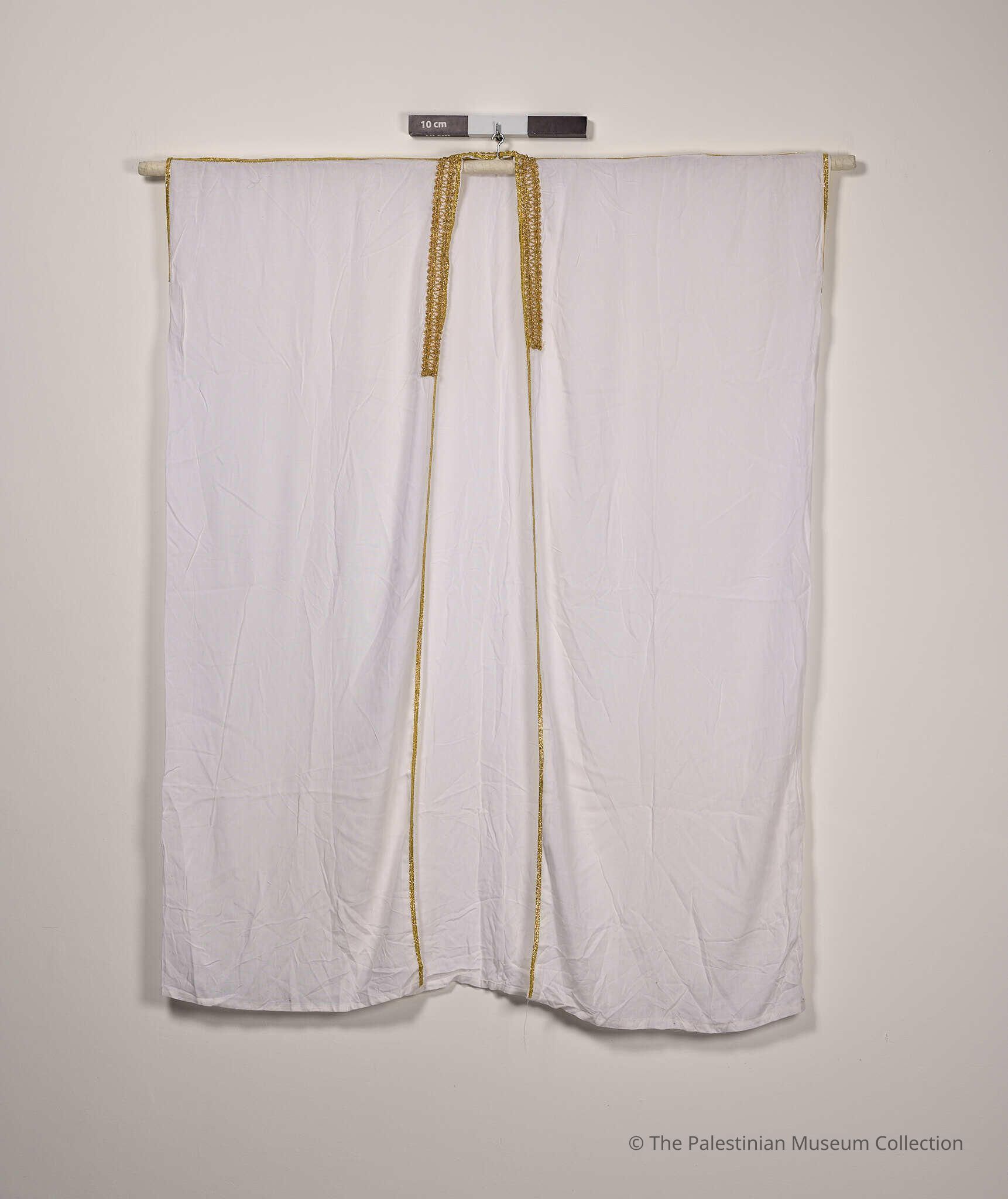 Abaya, a traditional Arab garment worn by Bedouins in Palestine and Jordan. It is made of white cotton and embroidered with gilded qasab (metallic couching cords). It has an open front, extending from top to bottom, and features an embroidery of gilded qasab along the opening. Worn by men over the dishdasha, the abaya signifies symbols of manhood, sheikhdom, and prestige. Moreover, on a daughter's wedding day, it is customary for a father to wear the abaya as a symbol of his protection and presence, even as she moves to her husband's home.Made/Created