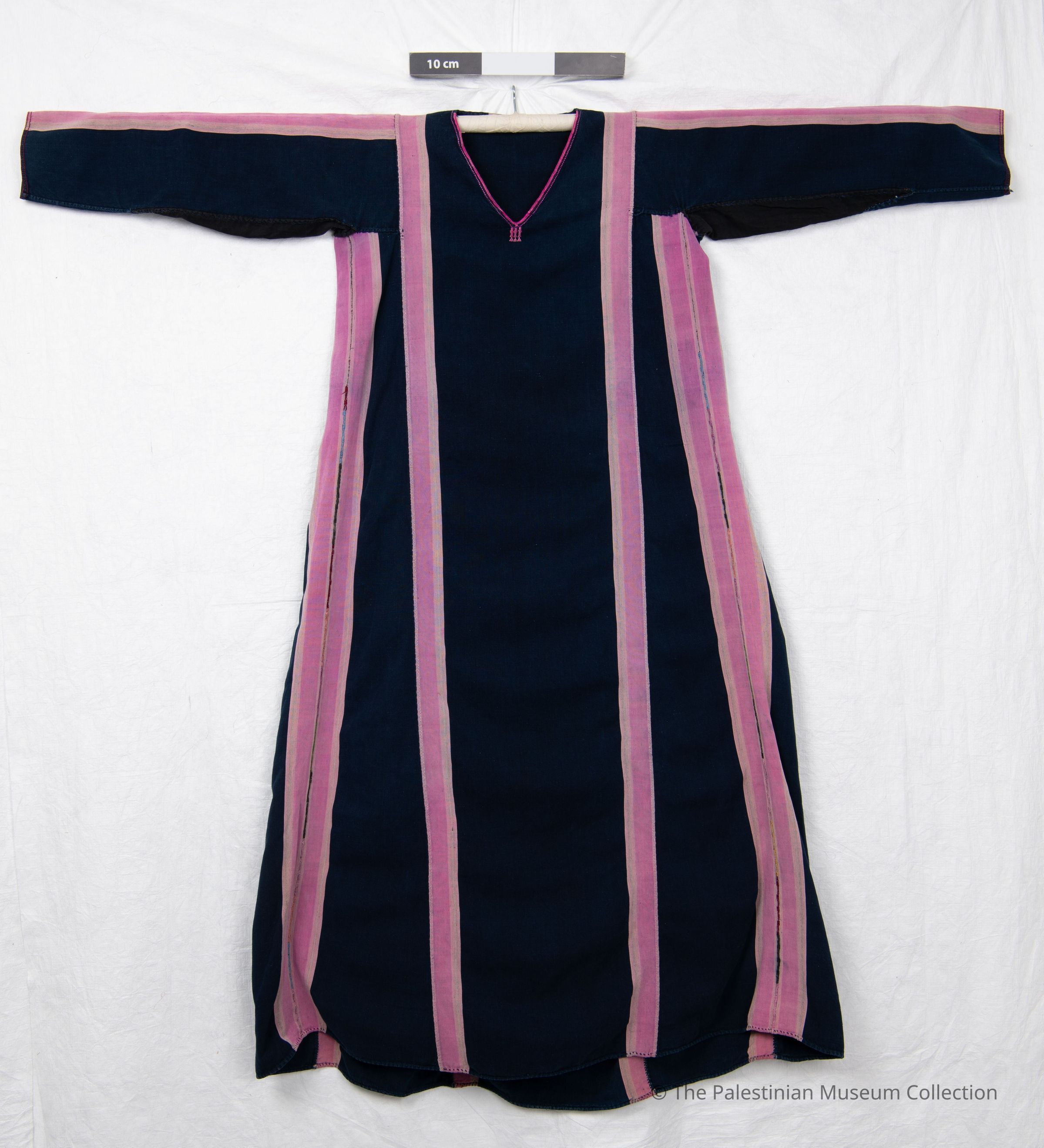 ثوب من منطقة غزة، من القماش المجدلاوي (أبو حزّين) باللون الكحلي والوردي، مُطرّز بخيوط من حرير باللون الفوشي. قبة الثوب مُطرّزة بشكل خفيف جداُ عند منطقة العنق بعرق قلادة الحجابات، أما الأكتاف والردهة الخلفية والأكمام فلا تحمل أي تطريز. لا يظهر أي تطريز على البدن الأمامي والخلفي للثوب سوى عرق المناجل على البدن الأمامي والتي تربط القماش الوردي بالكحلي.