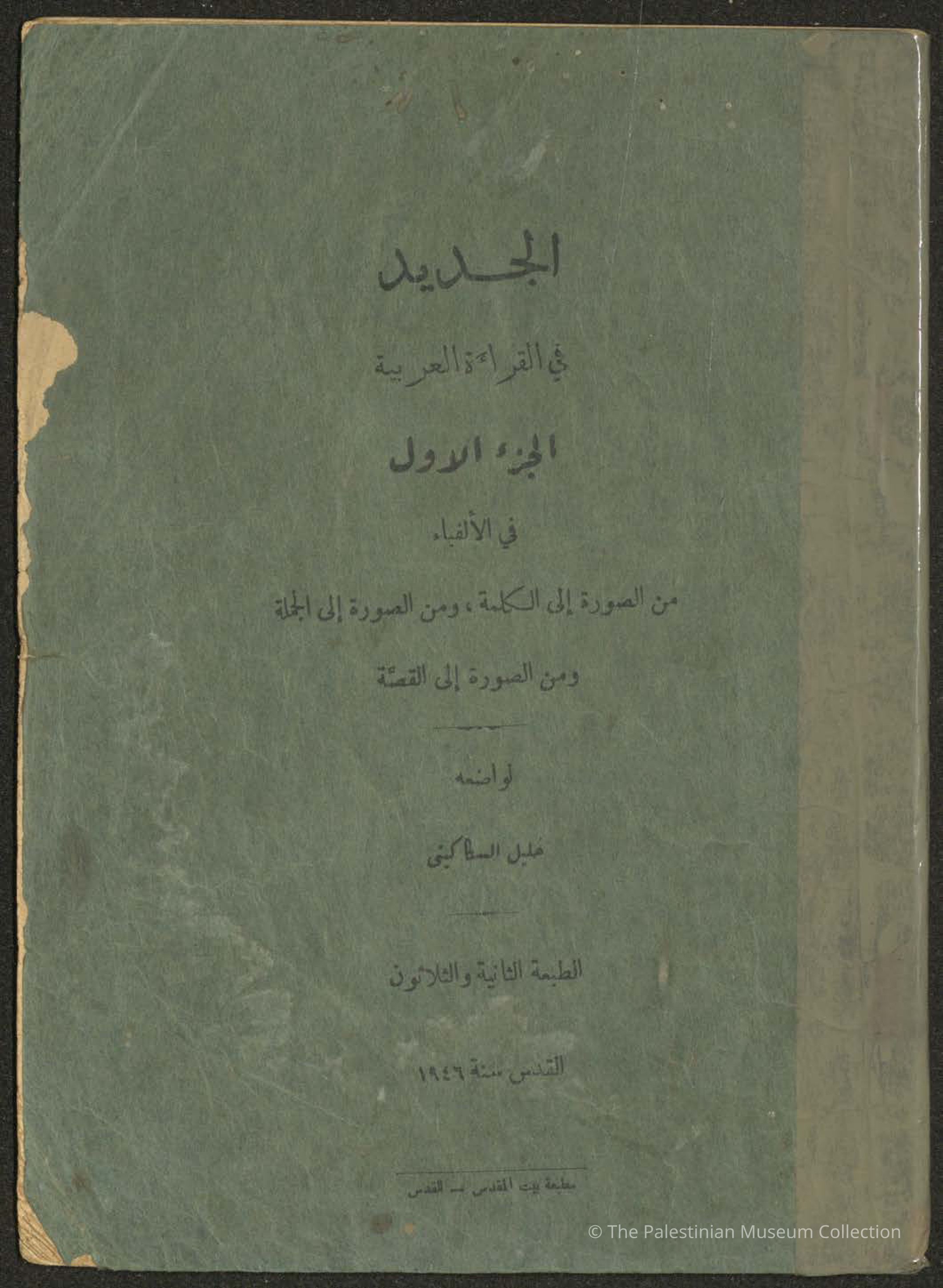 Part I of "Al-Jadeed Fil-Qeraa al-Arabeyyah," (New in Arabic Reading) authored by Khalil Sakakini, an intellectual, philosopher, educator, and a prominent figure of Palestinian national culture. The book was published by Beit al-Maqdis Press in Jerusalem in 1946 and is 64 pages long.Dimensions